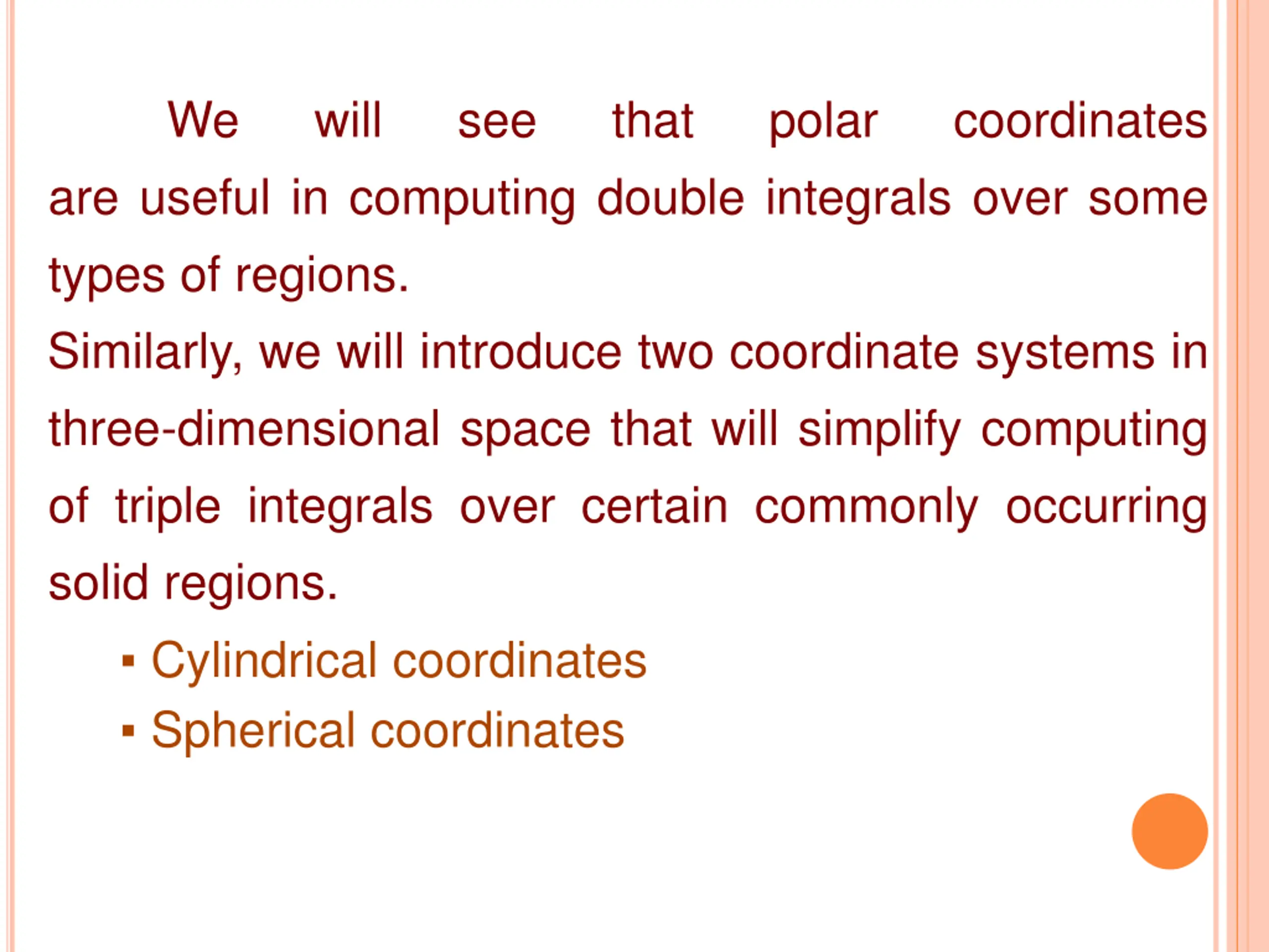 We will see that polar coordinates are useful in computing double integrals over some types of regions. Similarly, we will introduce two coordinate systems in three-dimensional space that will simplify computing of triple integrals over certain commonly occurring solid regions. Cylindrical coordinates Spherical coordinates