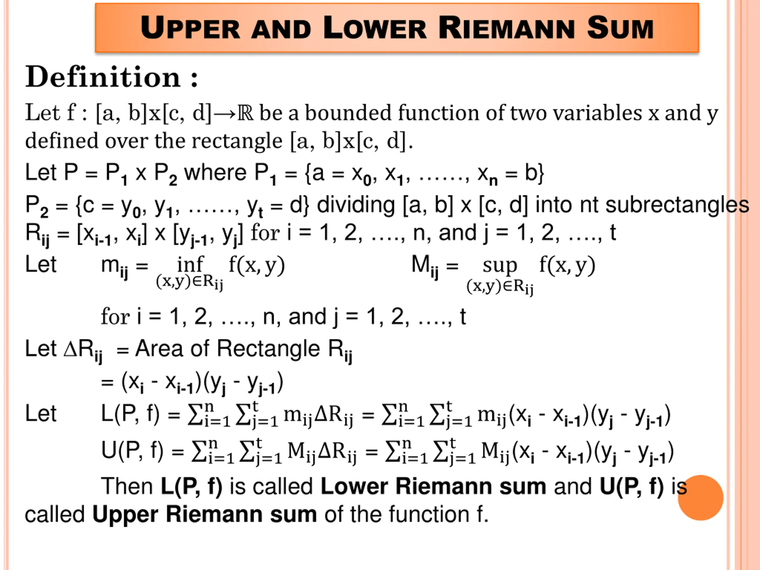 UPPER AND LOWER RIEMANN SUM Definition : Let f : [a, b]x[c, d] be a bounded function of two variables x and y defined over the rectangle [a, b]x[c, d]. Let P = P1x P2where P1= {a = x0, x1, , xn= b} P2= {c = y0, y1, , yt= d} dividing [a, b] x [c, d] into nt subrectangles Rij= [xi-1, xi] x [yj-1, yj] for i = 1, 2, ., n, and j = 1, 2, ., t Let mij= inf Mij= sup (x,y) Rijf(x,y) for i = 1, 2, ., n, and j = 1, 2, ., t Let Rij= Area of Rectangle Rij = (xi- xi-1)(yj- yj-1) Let L(P, f) = i=1 j=1 U(P, f) = i=1 j=1 Then L(P, f) is called Lower Riemann sum and U(P, f) is called Upper Riemann sum of the function f. f(x,y) (x,y) Rij t t n n mij Rij= i=1 Mij Rij= i=1 mij(xi- xi-1)(yj- yj-1) Mij(xi- xi-1)(yj- yj-1) j=1 j=1 t t n n
