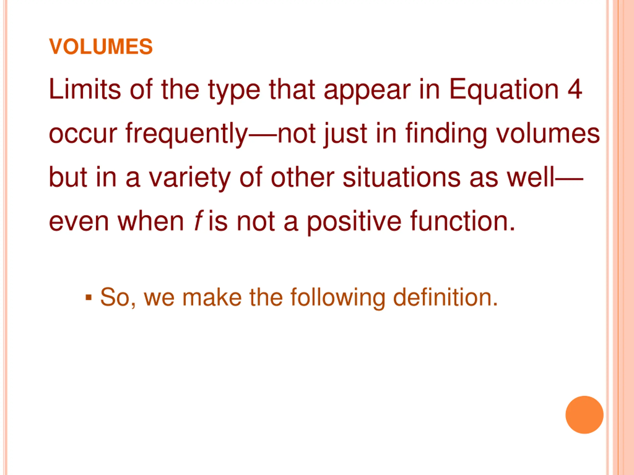 VOLUMES Limits of the type that appear in Equation 4 occur frequently not just in finding volumes but in a variety of other situations as well even when f is not a positive function. So, we make the following definition.