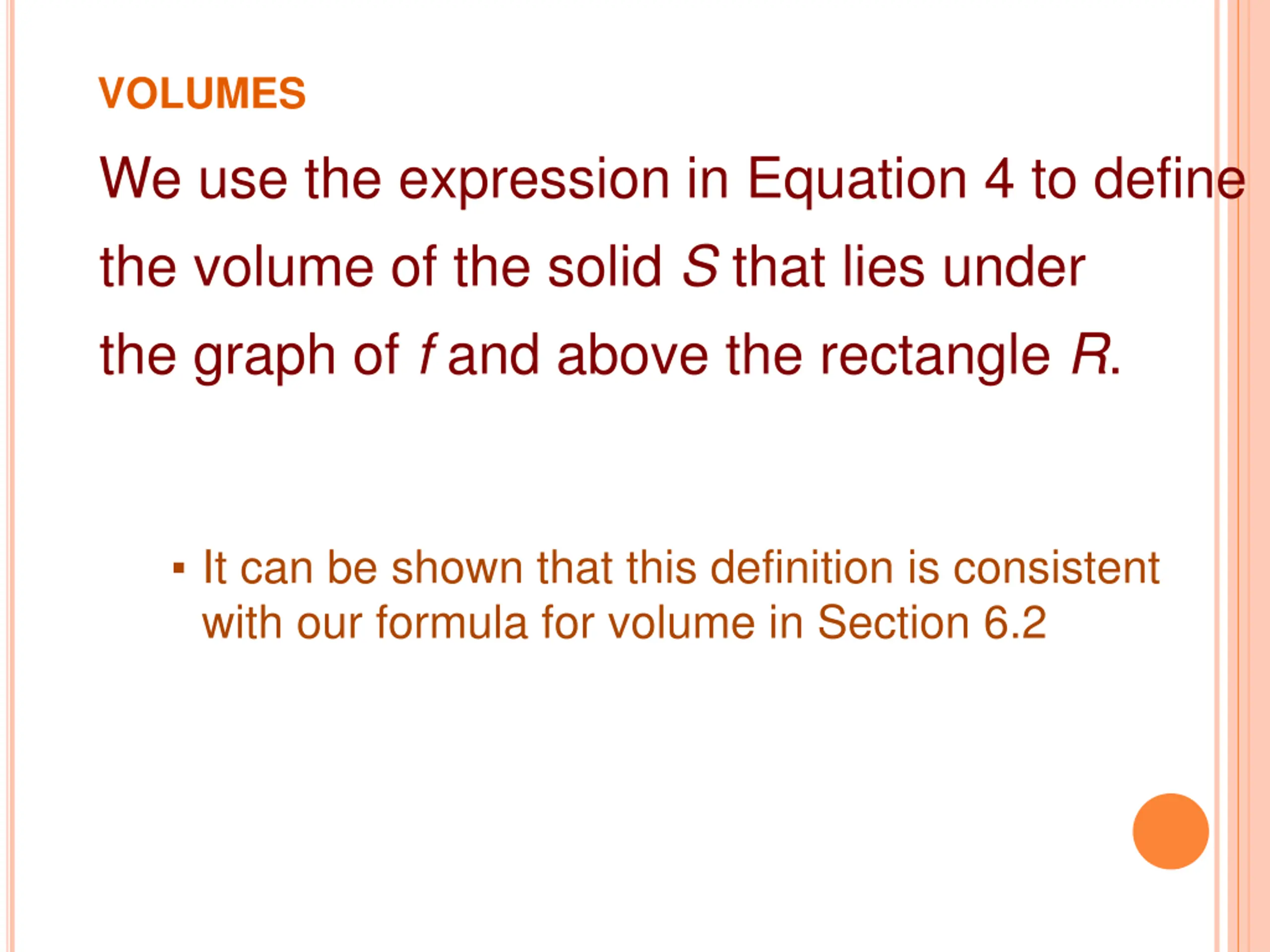 VOLUMES We use the expression in Equation 4 to define the volume of the solid S that lies under the graph of f and above the rectangle R. It can be shown that this definition is consistent with our formula for volume in Section 6.2