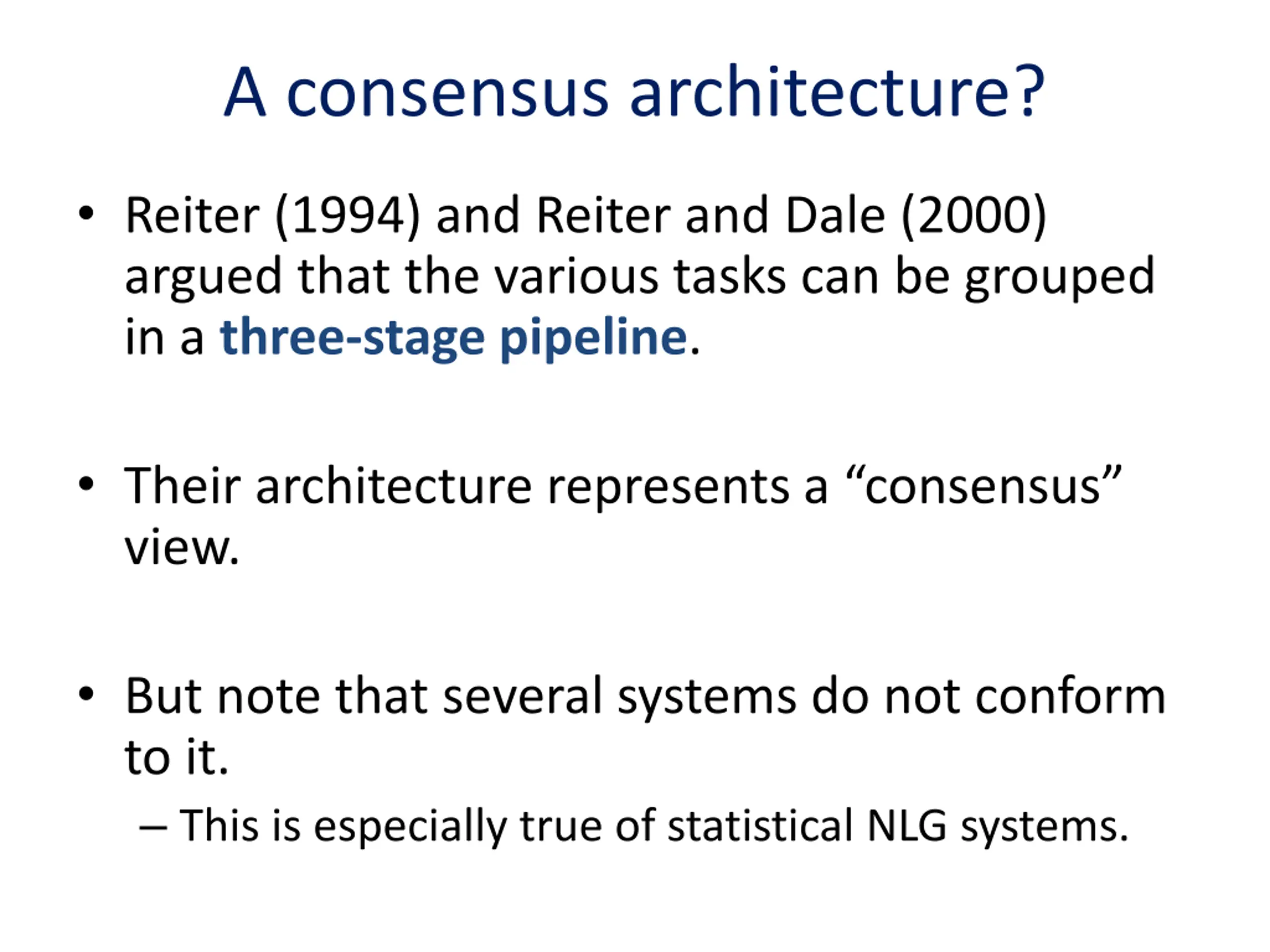 A consensus architecture? Reiter (1994) and Reiter and Dale (2000) argued that the various tasks can be grouped in a three-stage pipeline. Their architecture represents a consensus view. But note that several systems do not conform to it. This is especially true of statistical NLG systems.