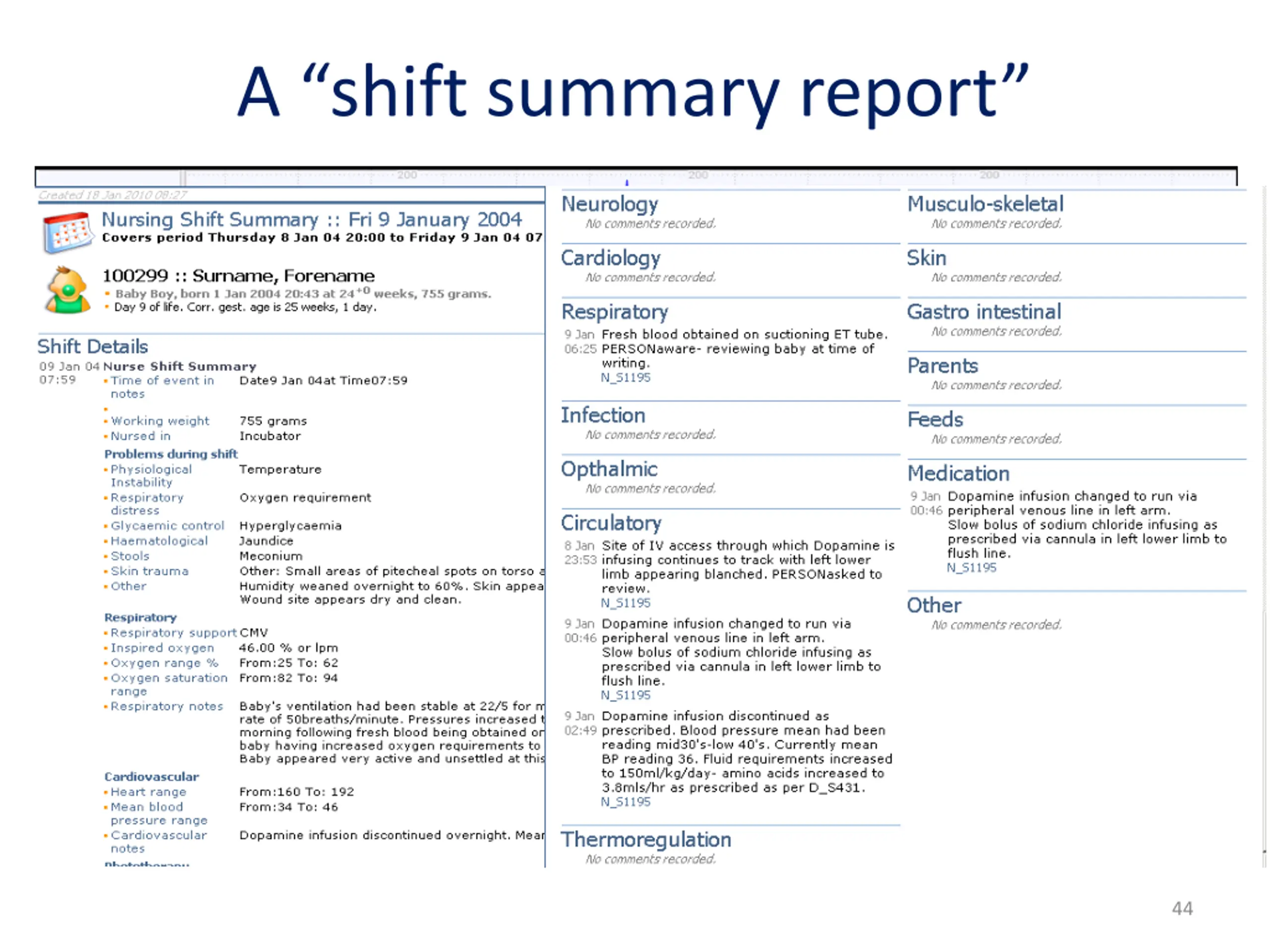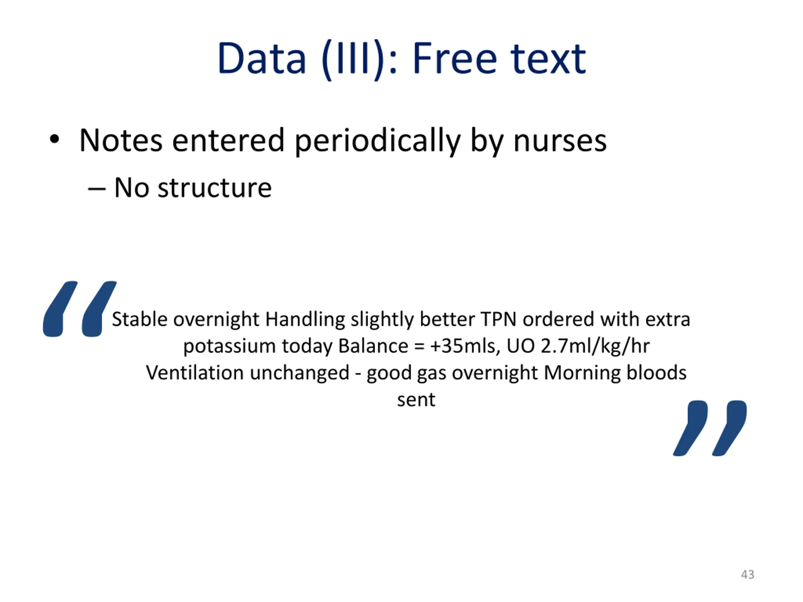 Data (III): Free text Notes entered periodically by nurses No structure Stable overnight Handling slightly better TPN ordered with extra potassium today Balance = +35mls, UO 2.7ml/kg/hr Ventilation unchanged - good gas overnight Morning bloods sent 43