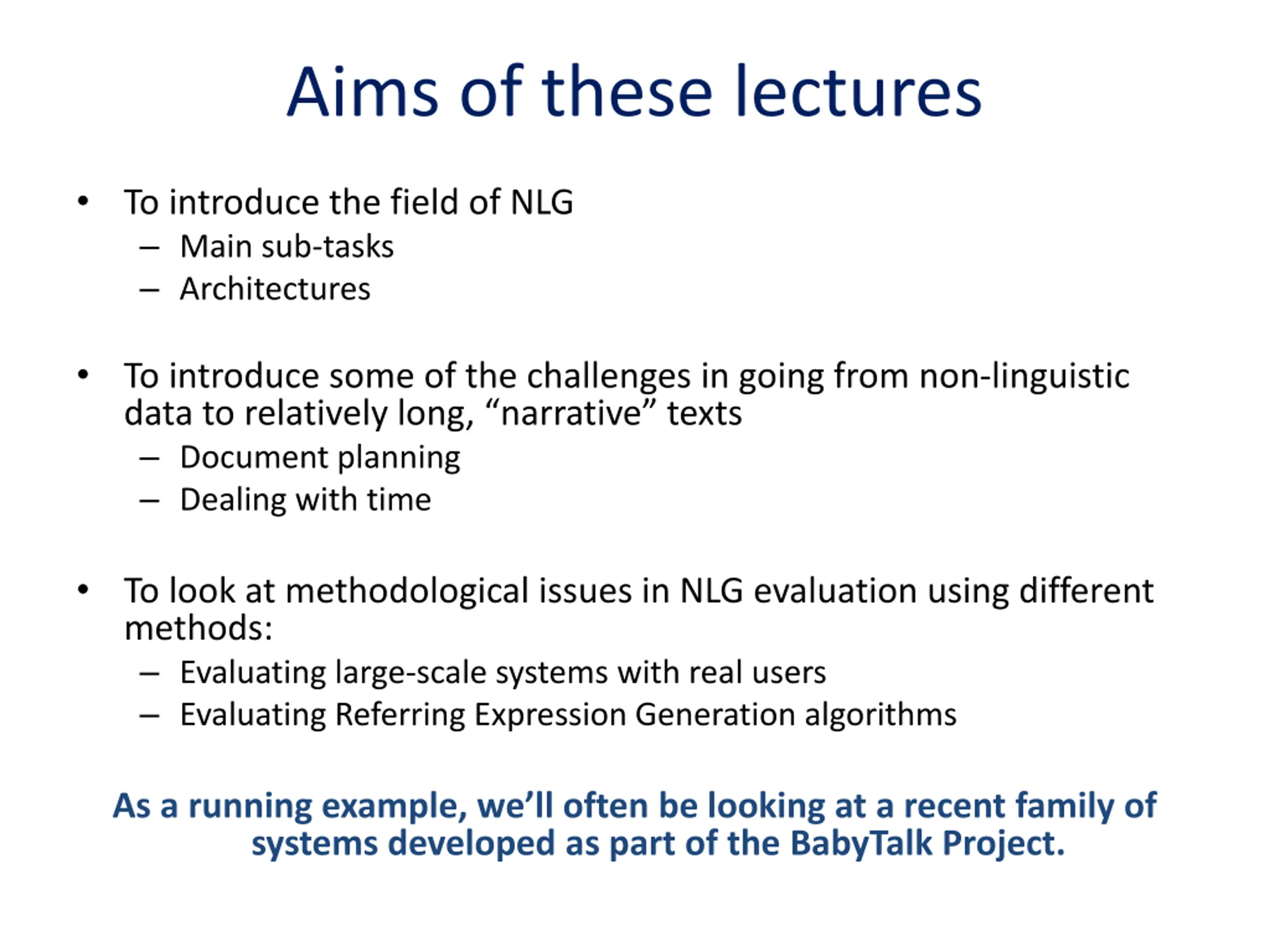 Aims of these lectures To introduce the field of NLG Main sub-tasks Architectures To introduce some of the challenges in going from non-linguistic data to relatively long, narrative texts Document planning Dealing with time To look at methodological issues in NLG evaluation using different methods: Evaluating large-scale systems with real users Evaluating Referring Expression Generation algorithms As a running example, we ll often be looking at a recent family of systems developed as part of the BabyTalk Project.
