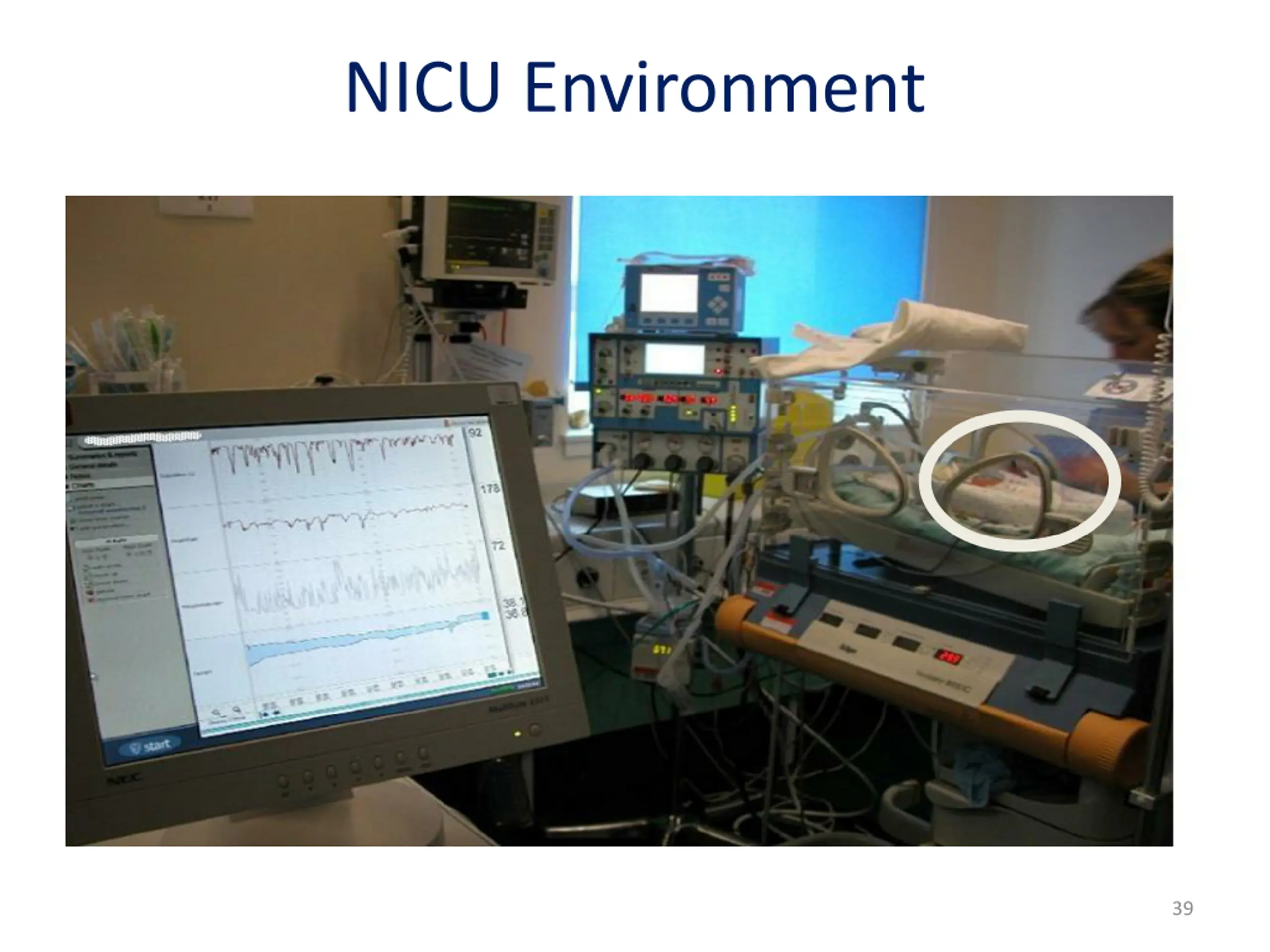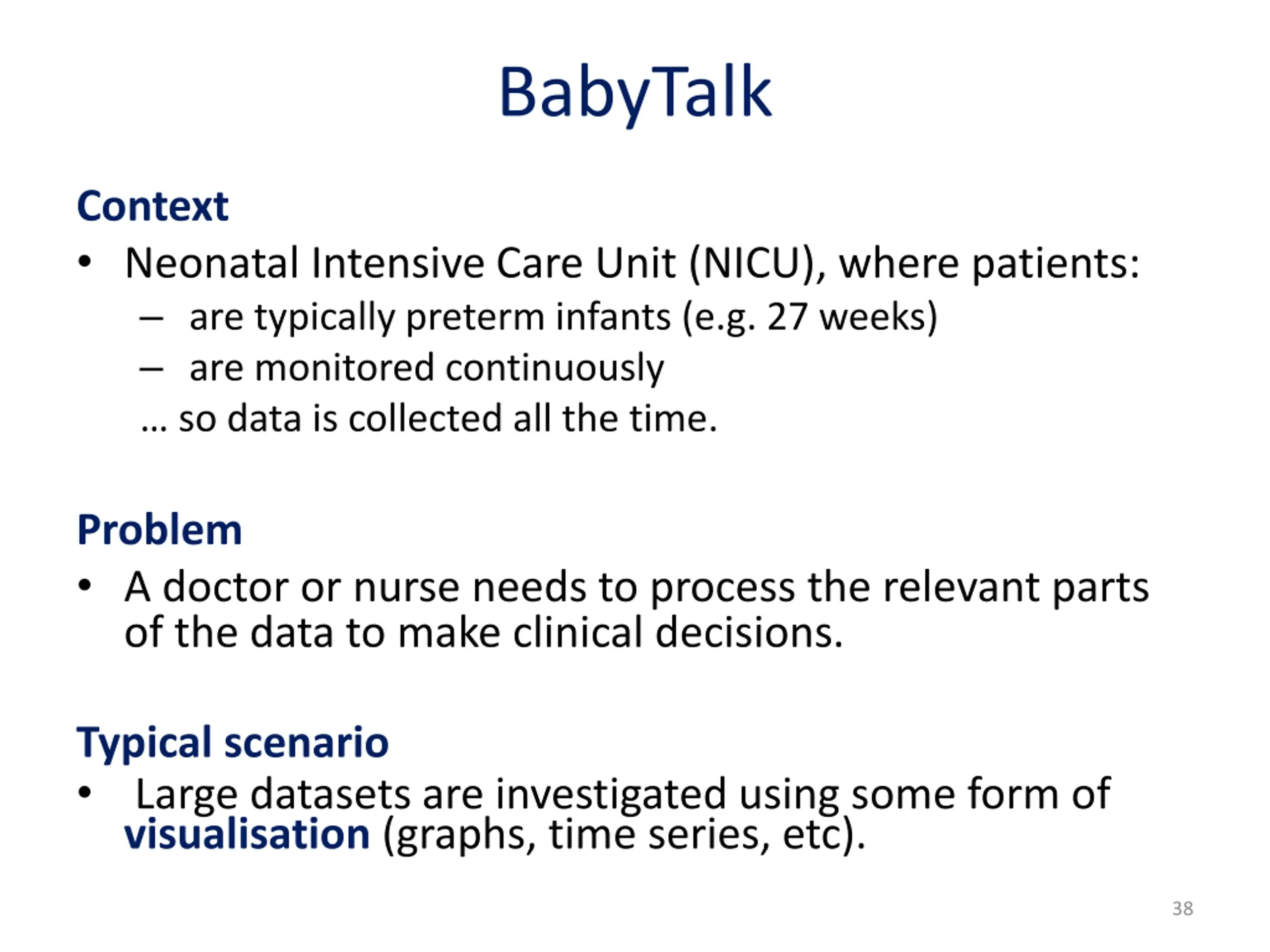 BabyTalk Context Neonatal Intensive Care Unit (NICU), where patients: are typically preterm infants (e.g. 27 weeks) are monitored continuously so data is collected all the time. Problem A doctor or nurse needs to process the relevant parts of the data to make clinical decisions. Typical scenario Large datasets are investigated using some form of visualisation (graphs, time series, etc). 38