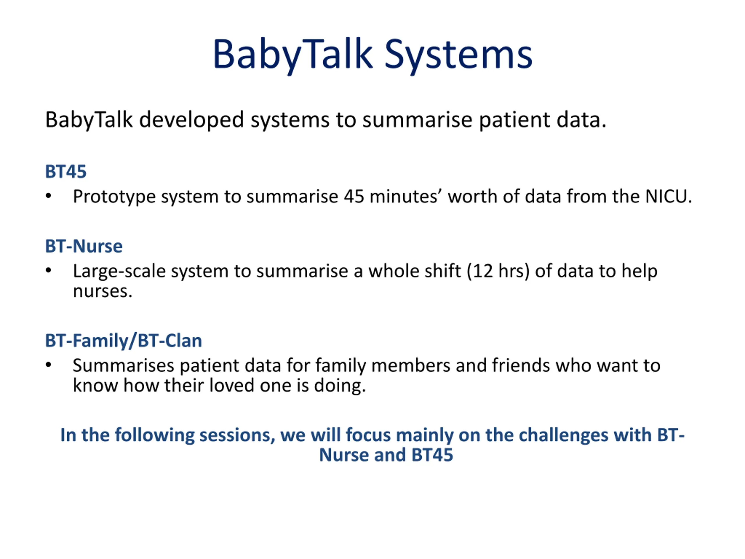 BabyTalk Systems BabyTalk developed systems to summarise patient data. BT45 Prototype system to summarise 45 minutes worth of data from the NICU. BT-Nurse Large-scale system to summarise a whole shift (12 hrs) of data to help nurses. BT-Family/BT-Clan Summarises patient data for family members and friends who want to know how their loved one is doing. In the following sessions, we will focus mainly on the challenges with BT- Nurse and BT45