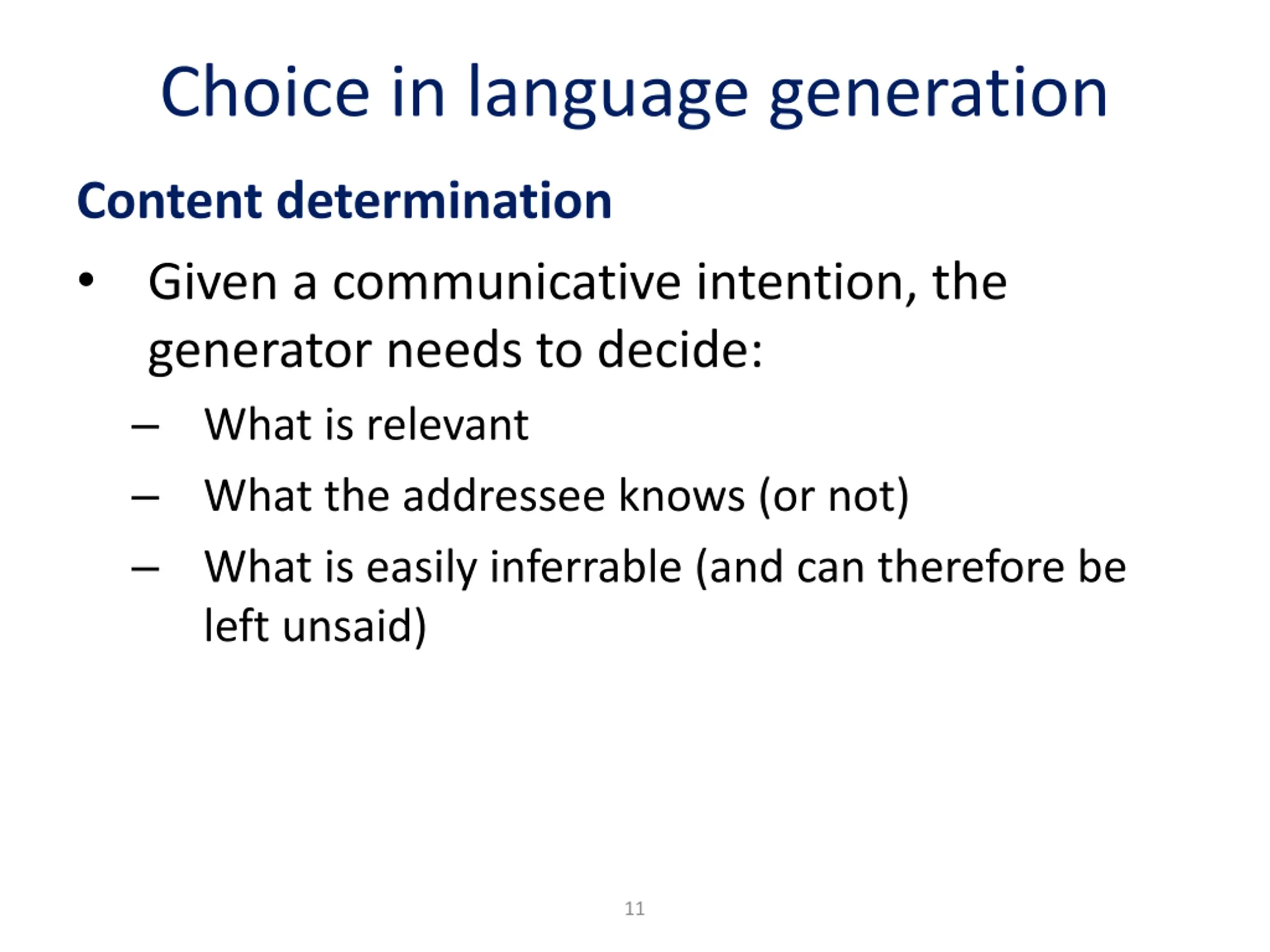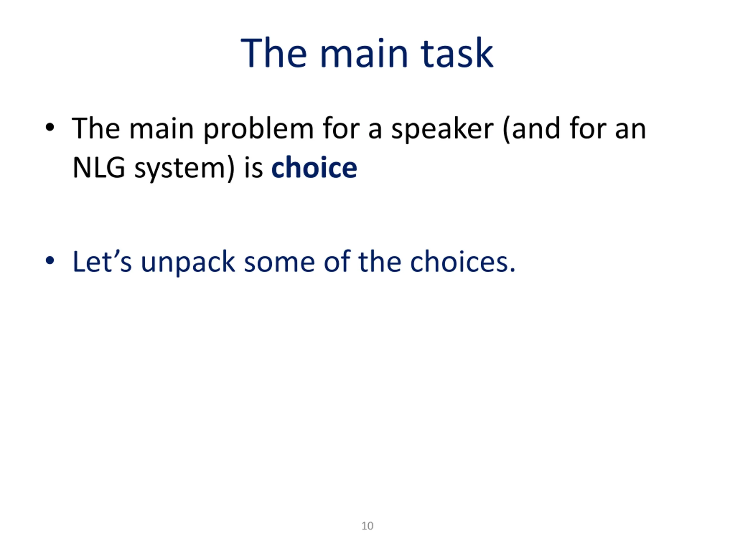 The main task The main problem for a speaker (and for an NLG system) is choice Let s unpack some of the choices. 10