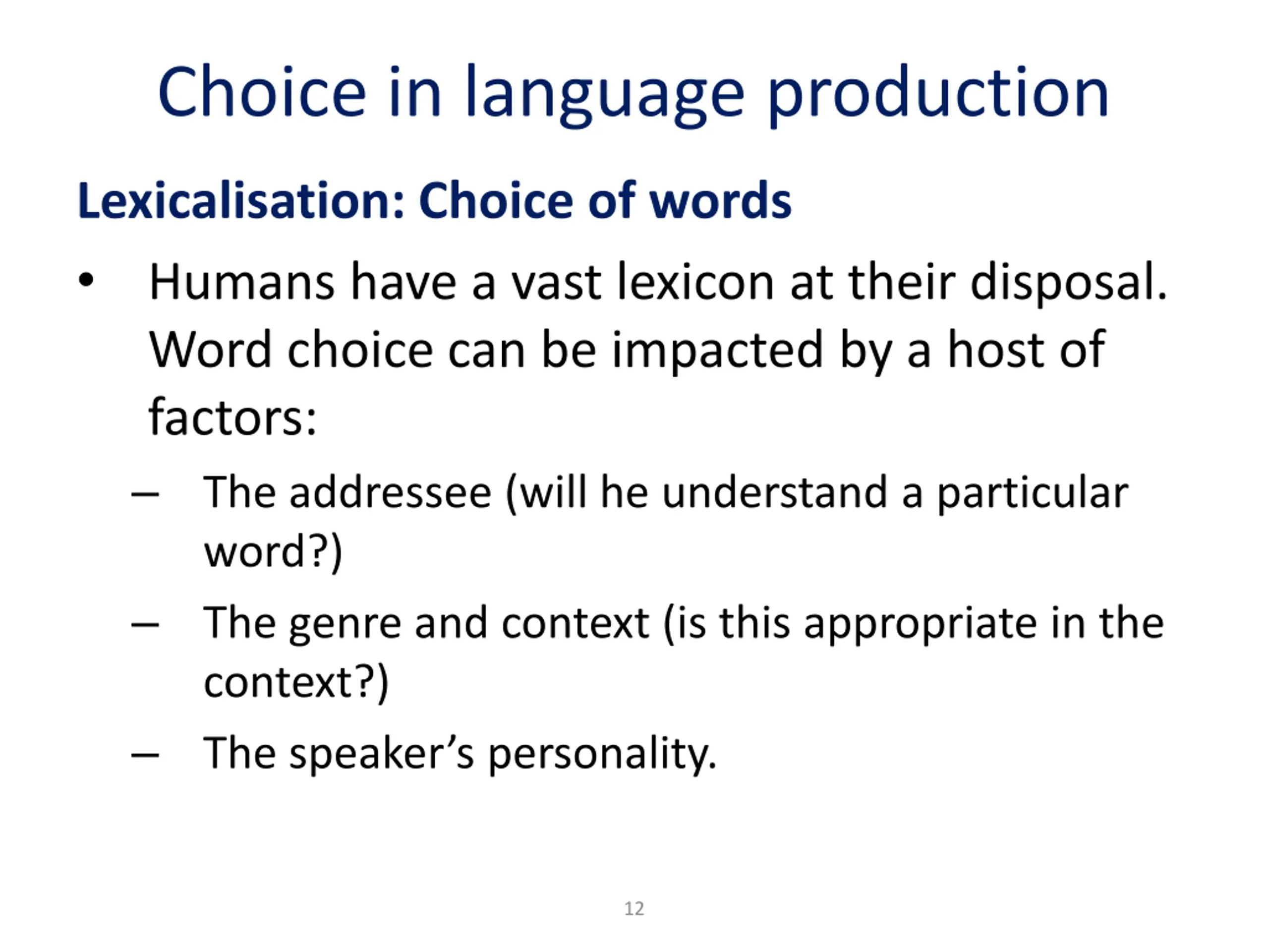 Choice in language production Lexicalisation: Choice of words Humans have a vast lexicon at their disposal. Word choice can be impacted by a host of factors: The addressee (will he understand a particular word?) The genre and context (is this appropriate in the context?) The speaker s personality. 12