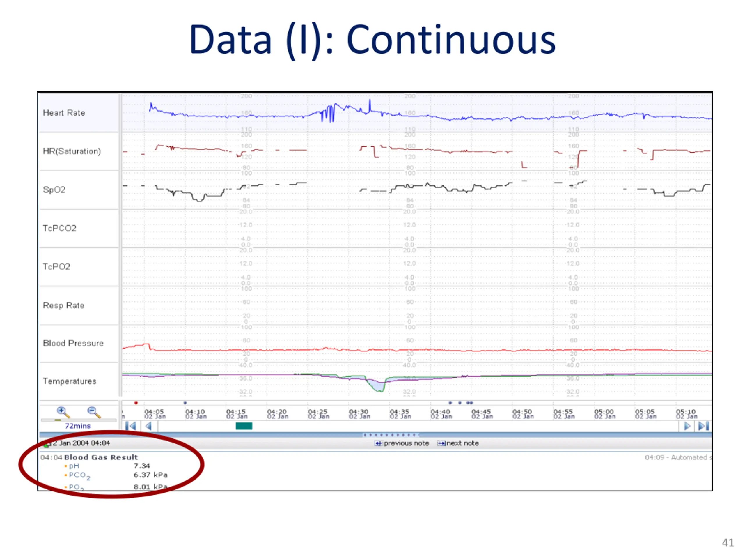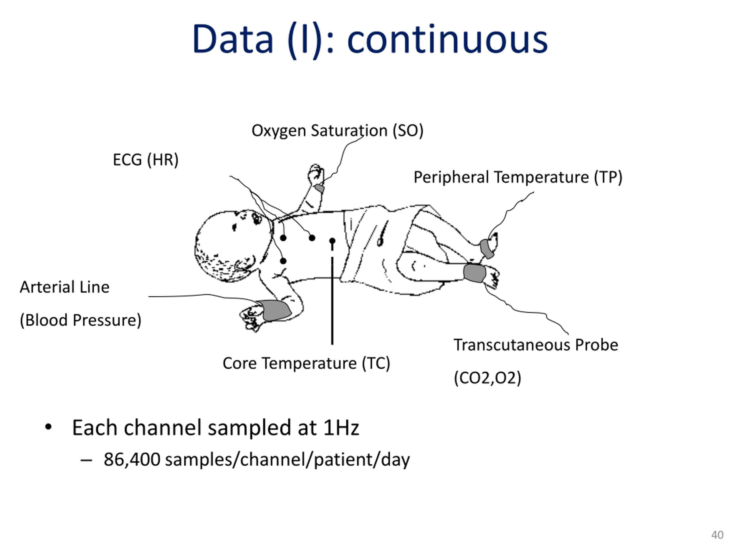 Data (I): continuous Oxygen Saturation (SO) ECG (HR) Peripheral Temperature (TP) Arterial Line (Blood Pressure) Transcutaneous Probe Core Temperature (TC) (CO2,O2) Each channel sampled at 1Hz 86,400 samples/channel/patient/day 40