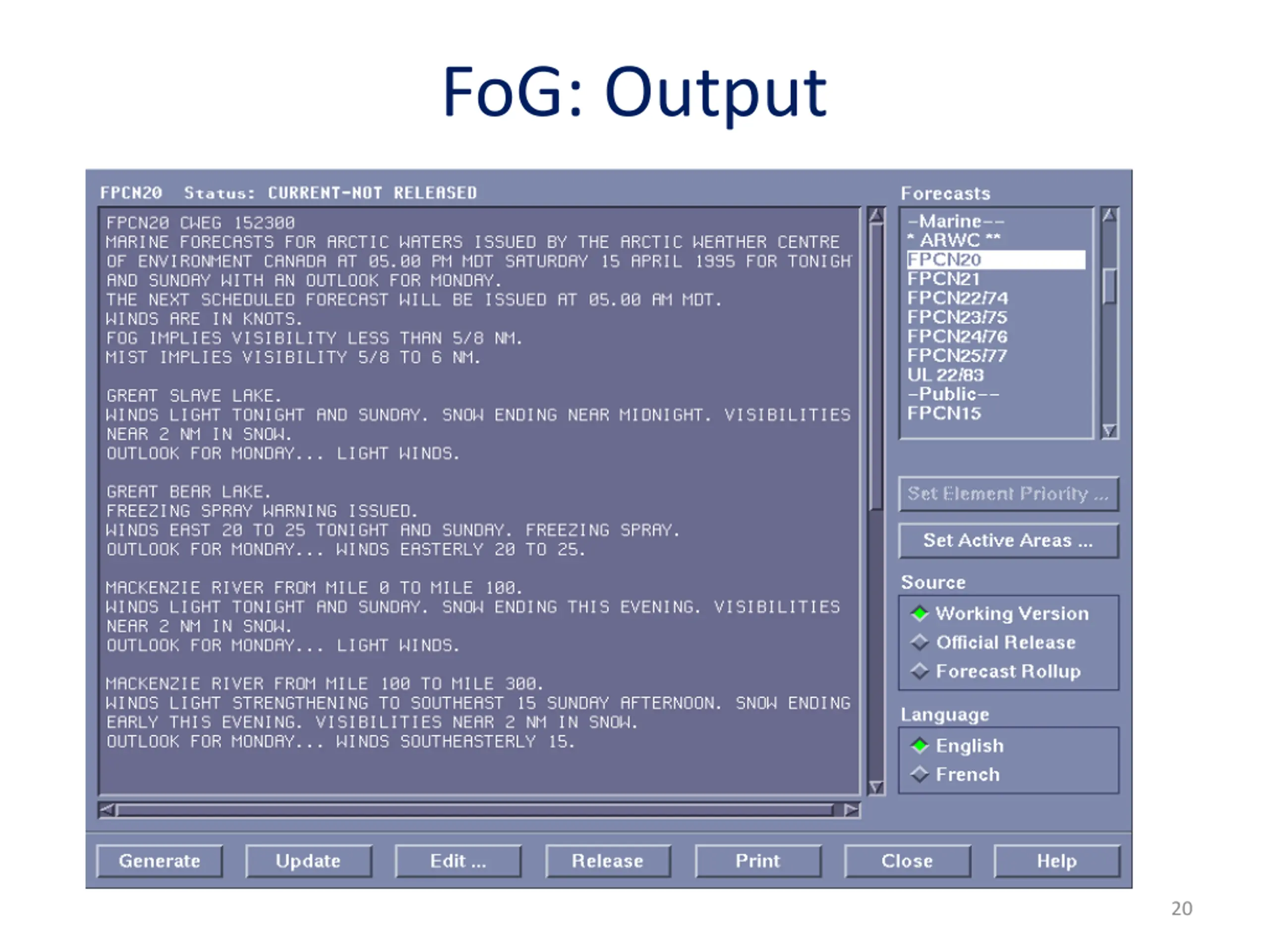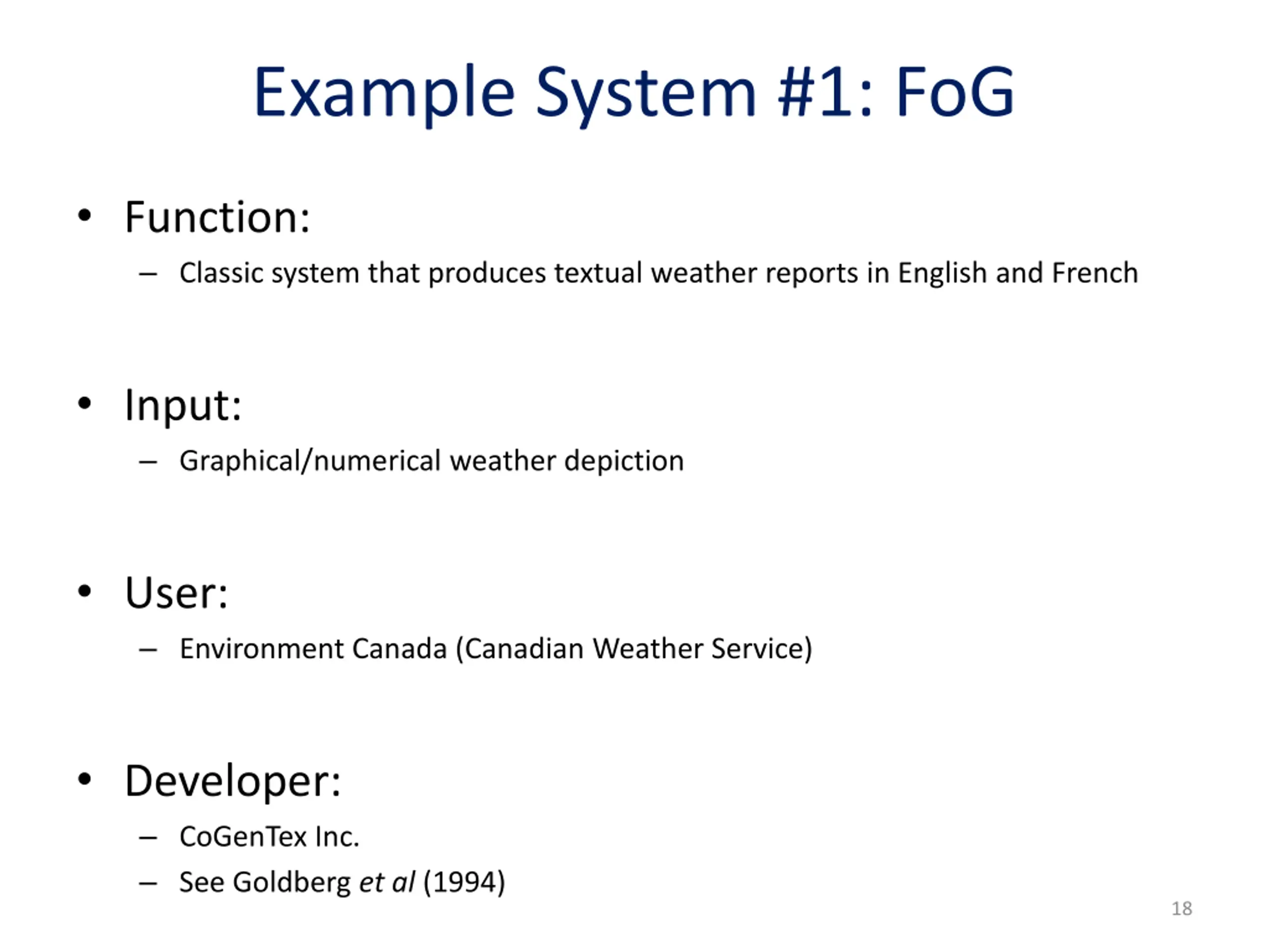 Example System #1: FoG Function: Classic system that produces textual weather reports in English and French Input: Graphical/numerical weather depiction User: Environment Canada (Canadian Weather Service) Developer: CoGenTex Inc. See Goldberg et al (1994) 18