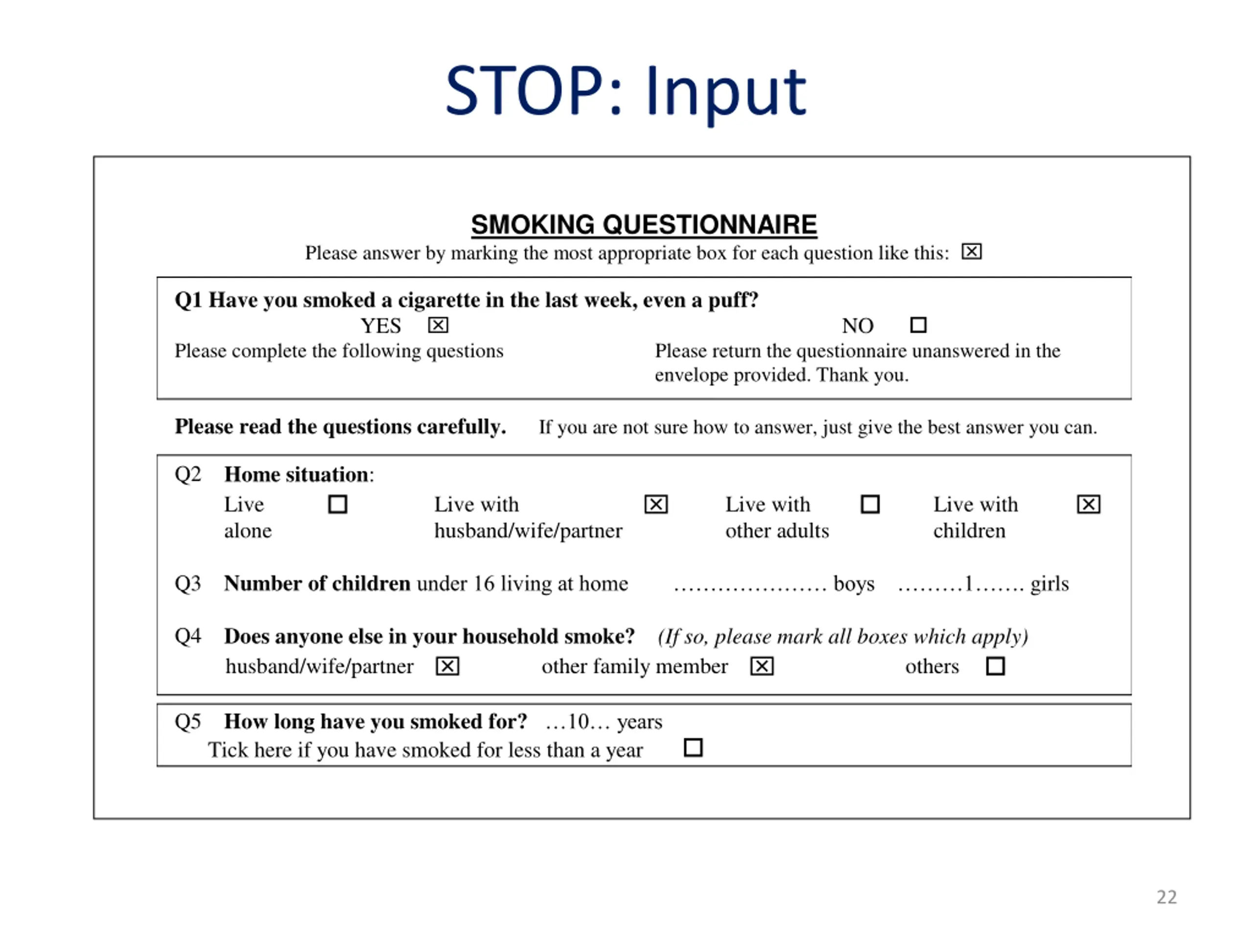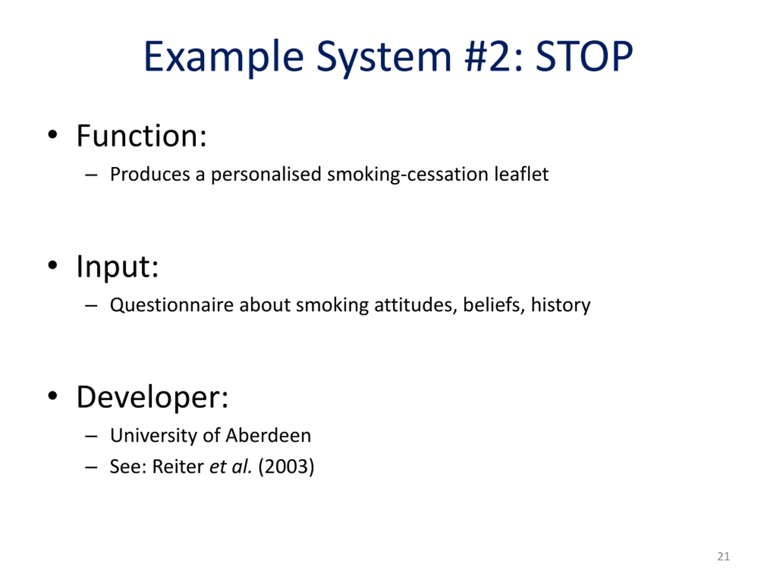 Example System #2: STOP Function: Produces a personalised smoking-cessation leaflet Input: Questionnaire about smoking attitudes, beliefs, history Developer: University of Aberdeen See: Reiter et al. (2003) 21