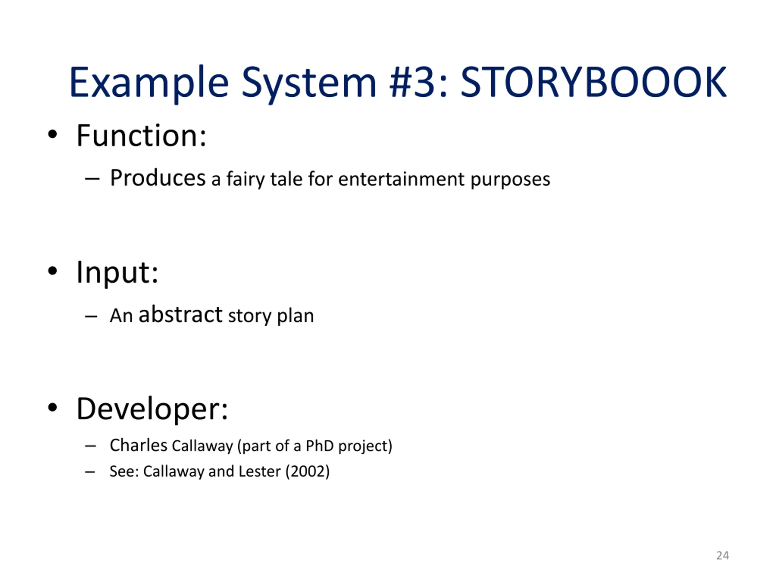Example System #3: STORYBOOOK Function: Produces a fairy tale for entertainment purposes Input: An abstract story plan Developer: Charles Callaway (part of a PhD project) See: Callaway and Lester (2002) 24