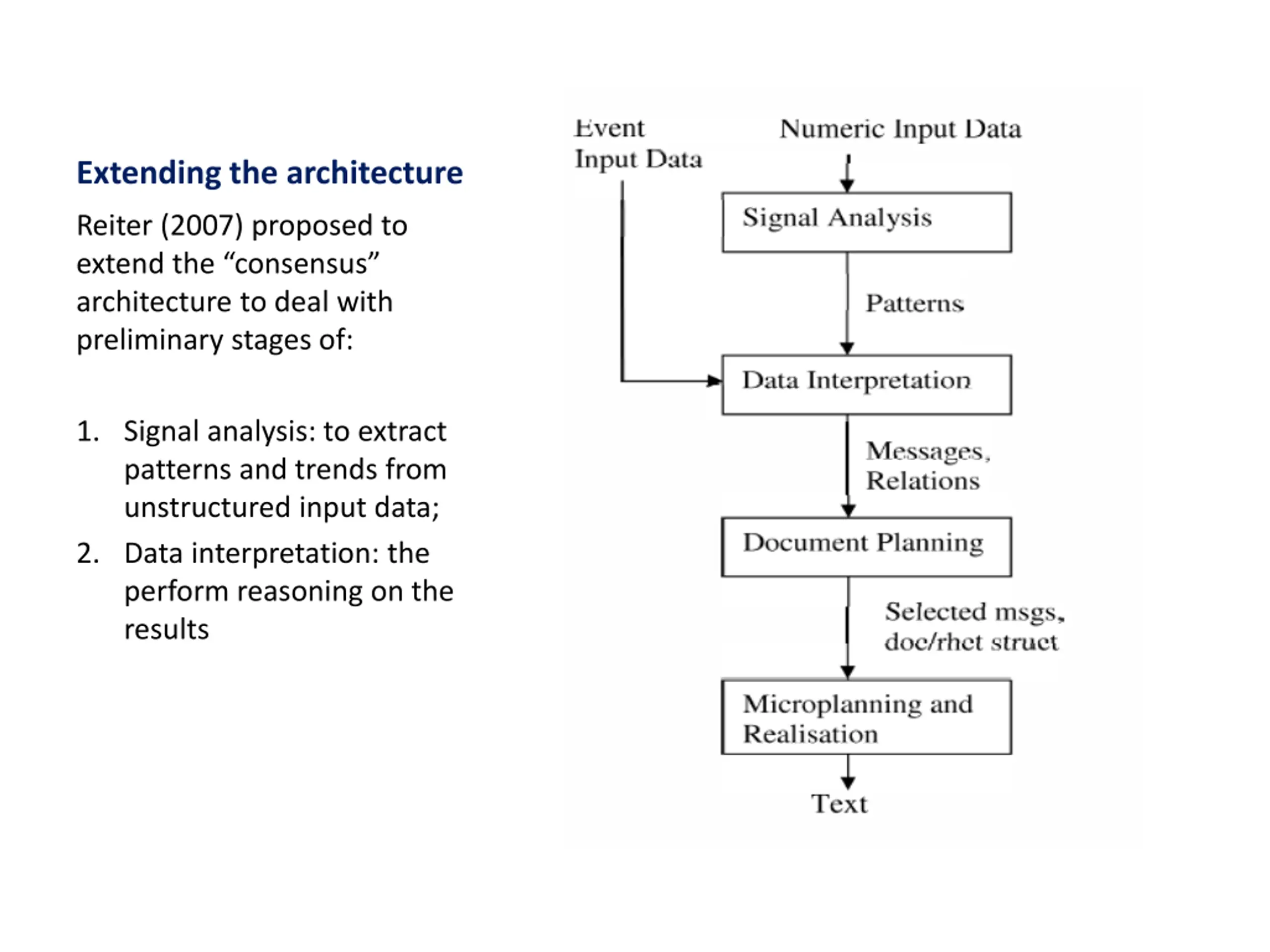 Extending the architecture Some NLG systems have to deal with raw, unstructured data. This means that prior to generating text, the data has to be analysed in order to: Identify the important things and filter out noise Map the data to appropriate input representations Perform some reasoning on these representations