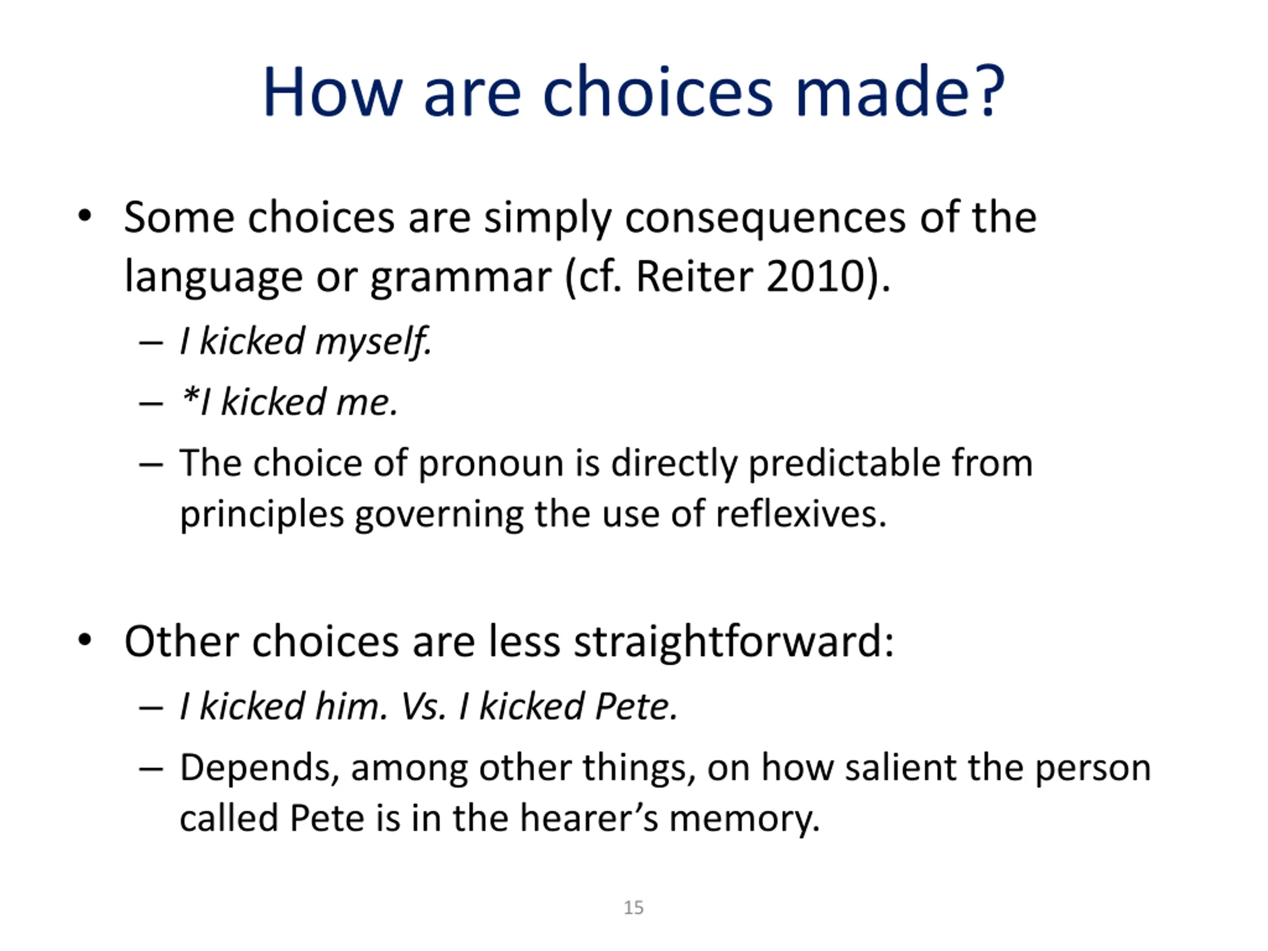 How are choices made? Some choices are simply consequences of the language or grammar (cf. Reiter 2010). I kicked myself. *I kicked me. The choice of pronoun is directly predictable from principles governing the use of reflexives. Other choices are less straightforward: I kicked him. Vs. I kicked Pete. Depends, among other things, on how salient the person called Pete is in the hearer s memory. 15