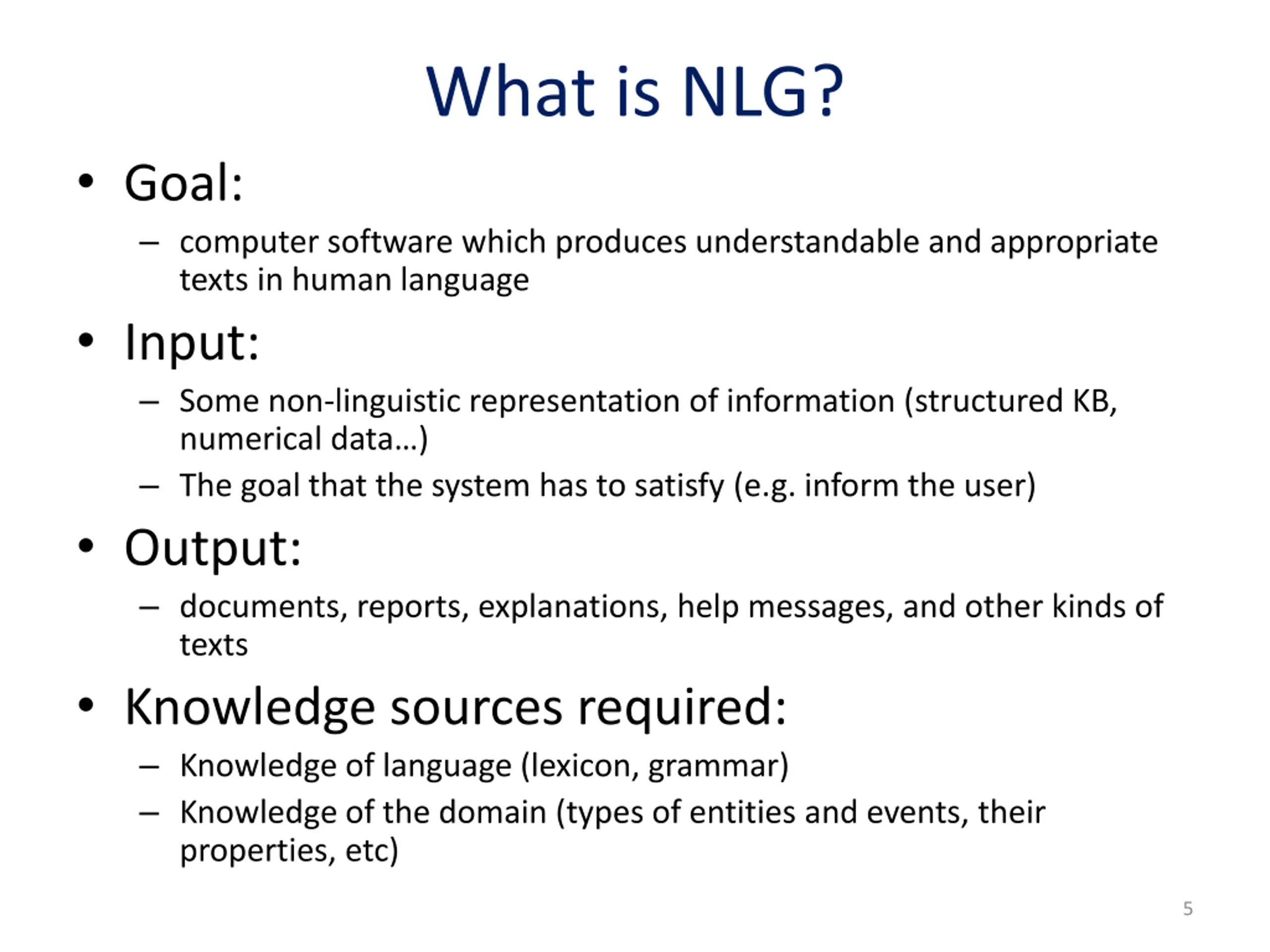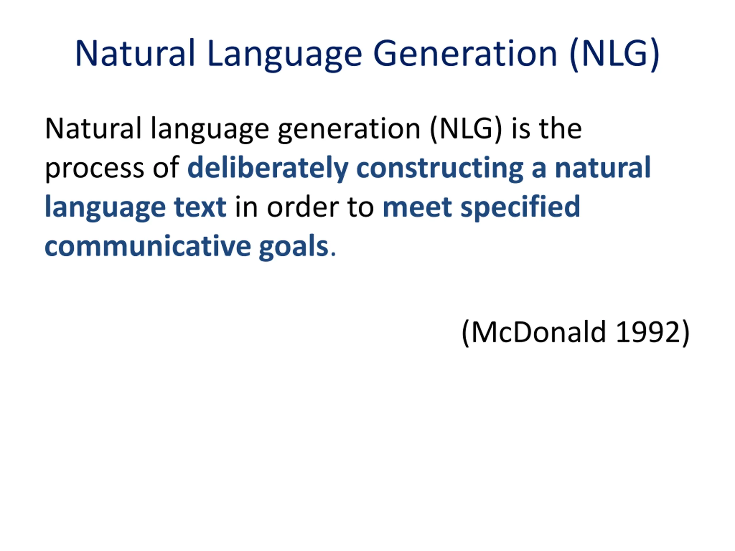 Natural Language Generation (NLG) Natural language generation (NLG) is the process of deliberately constructing a natural language text in order to meet specified communicative goals. (McDonald 1992)