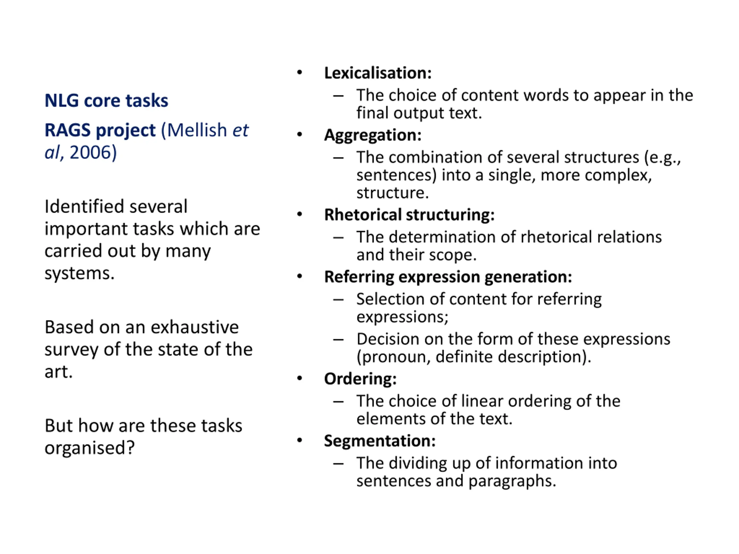 Lexicalisation: The choice of content words to appear in the final output text. Aggregation: The combination of several structures (e.g., sentences) into a single, more complex, structure. Rhetorical structuring: The determination of rhetorical relations and their scope. Referring expression generation: Selection of content for referring expressions; Decision on the form of these expressions (pronoun, definite description). Ordering: The choice of linear ordering of the elements of the text. Segmentation: The dividing up of information into sentences and paragraphs. NLG core tasks RAGS project (Mellish et al, 2006) Identified several important tasks which are carried out by many systems. Based on an exhaustive survey of the state of the art. But how are these tasks organised?