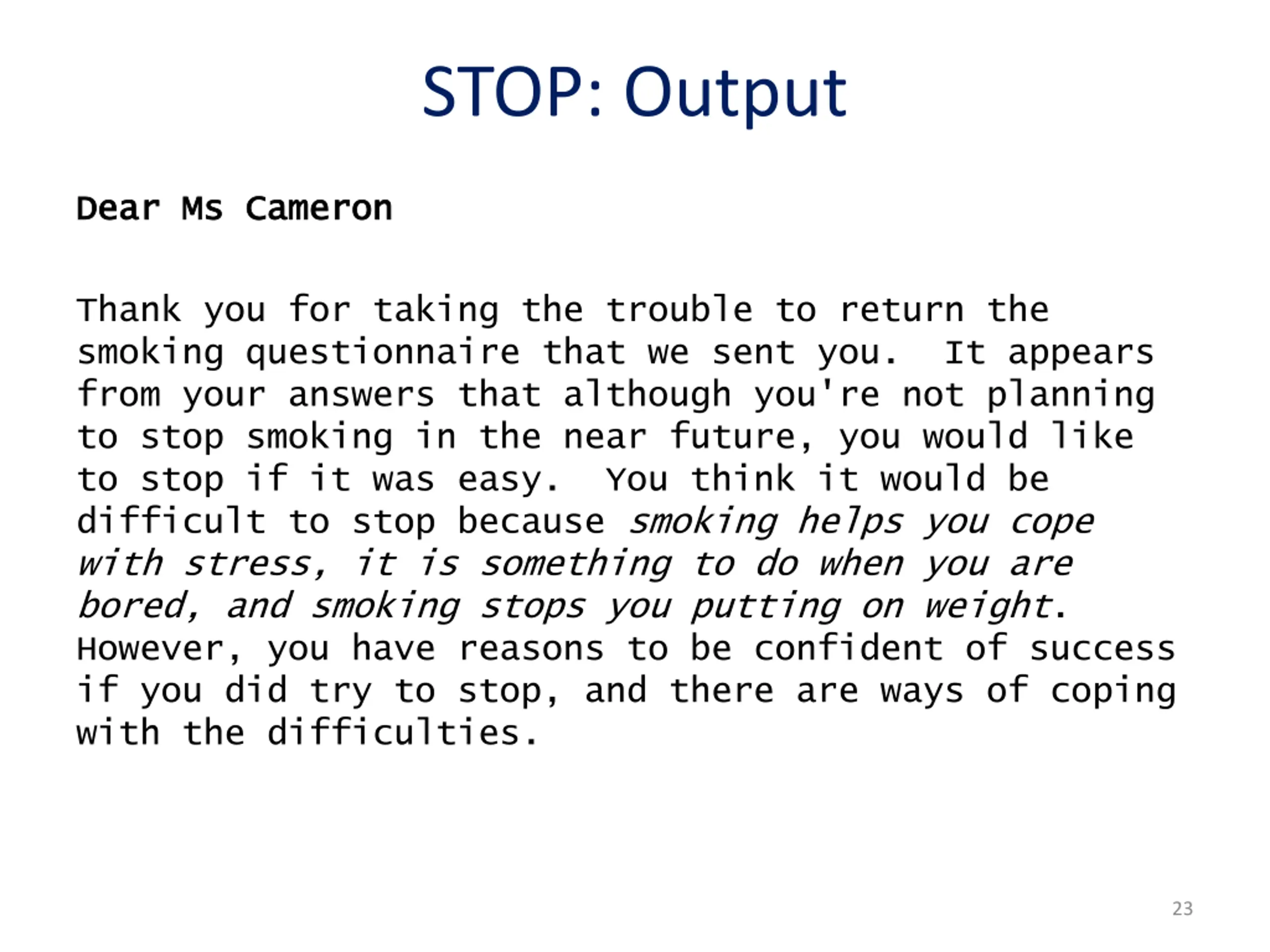 STOP: Output Dear Ms Cameron Dear Ms Cameron Thank you for taking the trouble to return the smoking questionnaire that we sent you. It appears from your answers that although you're not planning to stop smoking in the near future, you would like to stop if it was easy. You think it would be difficult to stop because smoking helps you cope with stress, it is something to do when you are bored, and smoking stops you putting on weight. However, you have reasons to be confident of success if you did try to stop, and there are ways of coping with the difficulties. 23