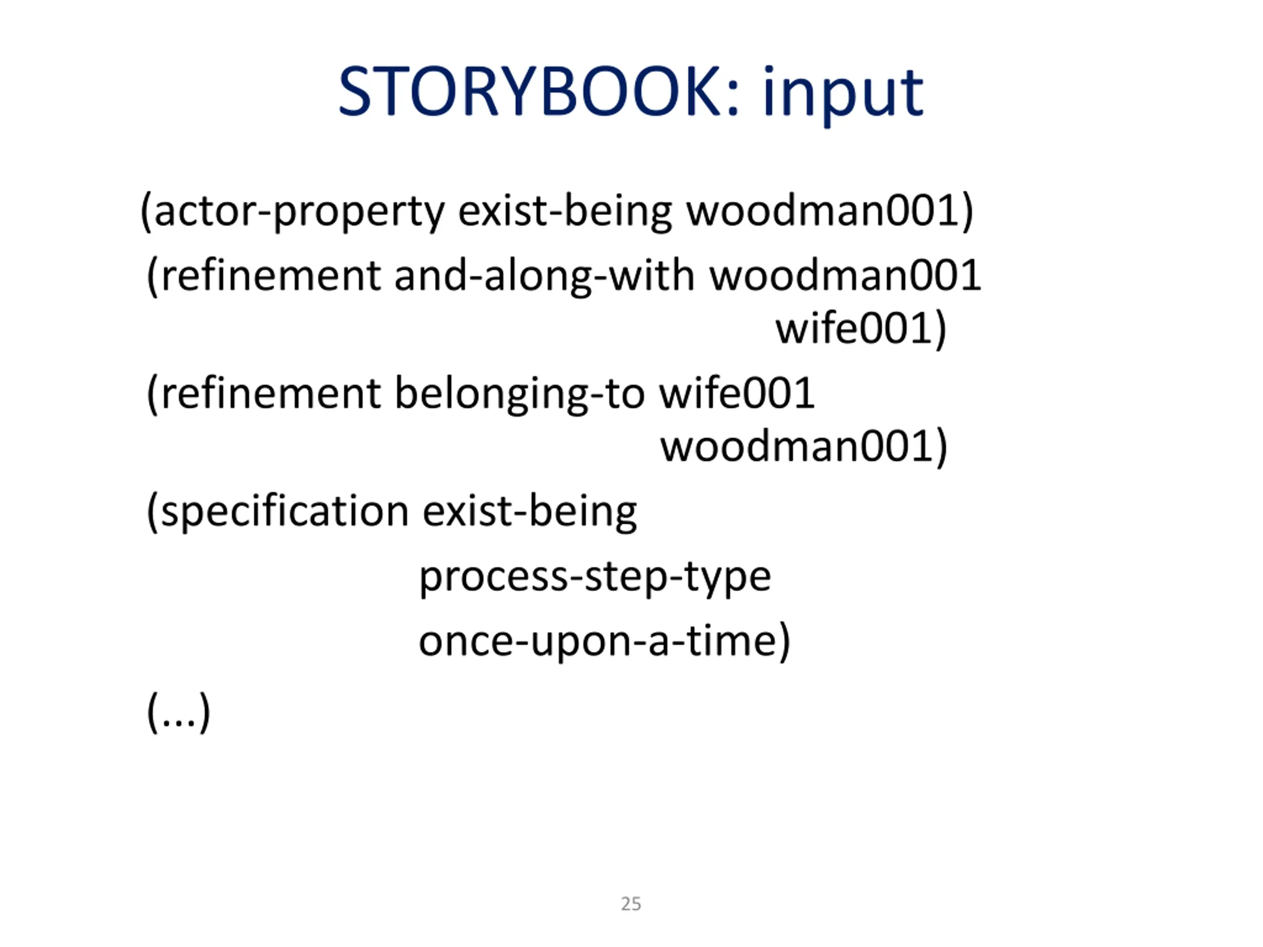 STORYBOOK: input (actor-property exist-being woodman001) (refinement and-along-with woodman001 (refinement belonging-to wife001 woodman001) (specification exist-being process-step-type once-upon-a-time) (...) wife001) 25