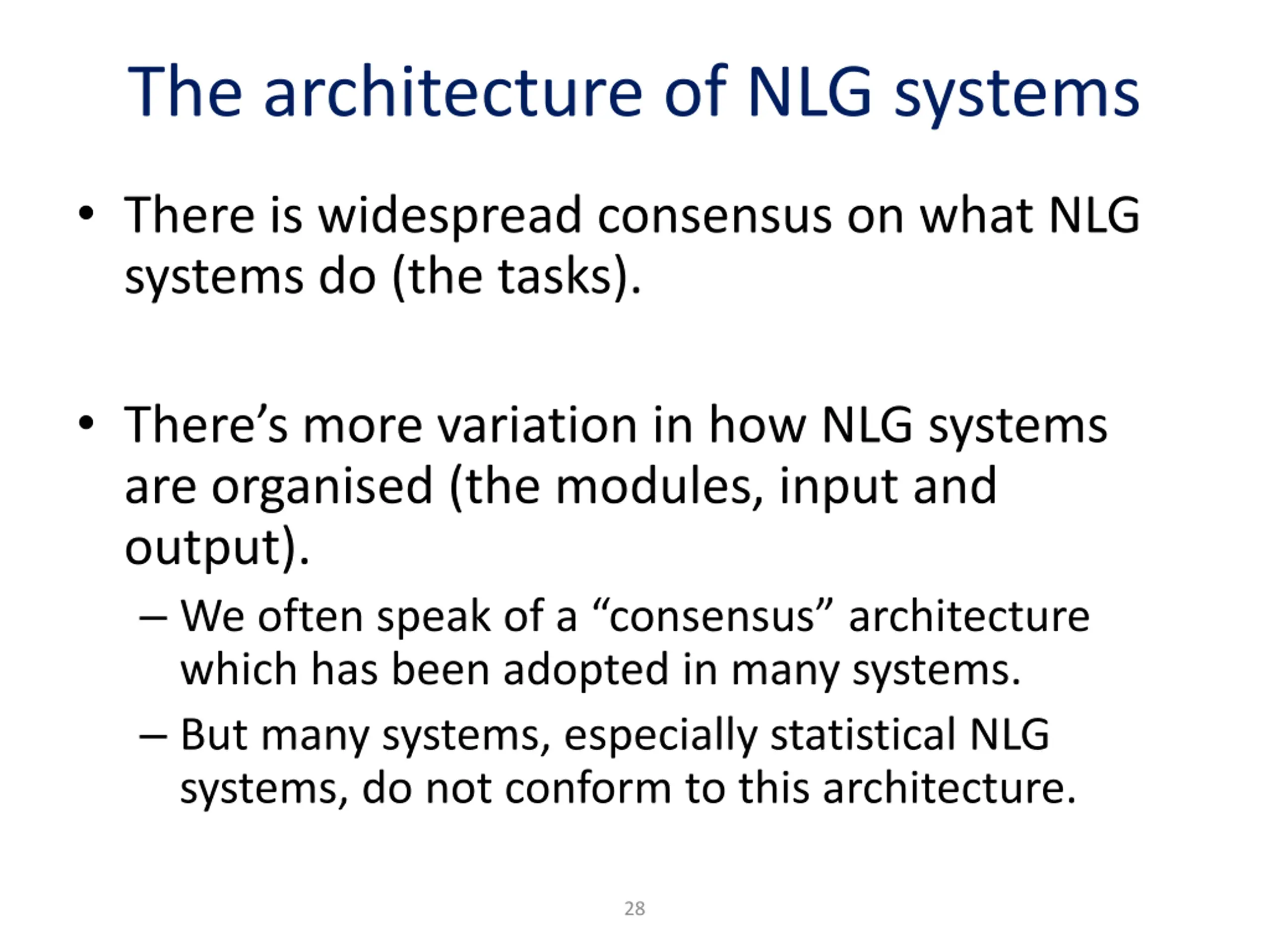 The architecture of NLG systems There is widespread consensus on what NLG systems do (the tasks). There s more variation in how NLG systems are organised (the modules, input and output). We often speak of a consensus architecture which has been adopted in many systems. But many systems, especially statistical NLG systems, do not conform to this architecture. 28