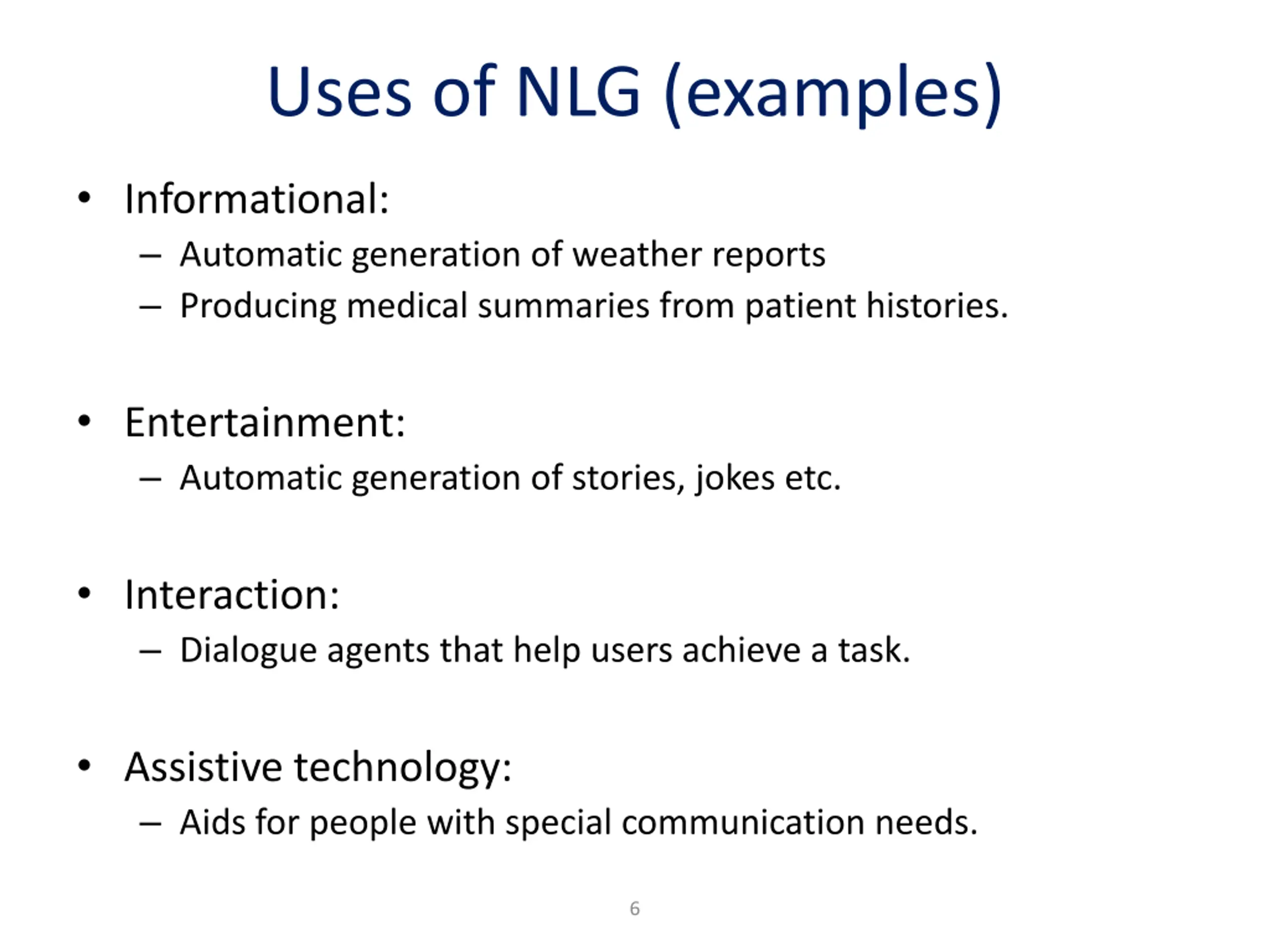 Uses of NLG (examples) Informational: Automatic generation of weather reports Producing medical summaries from patient histories. Entertainment: Automatic generation of stories, jokes etc. Interaction: Dialogue agents that help users achieve a task. Assistive technology: Aids for people with special communication needs. 6
