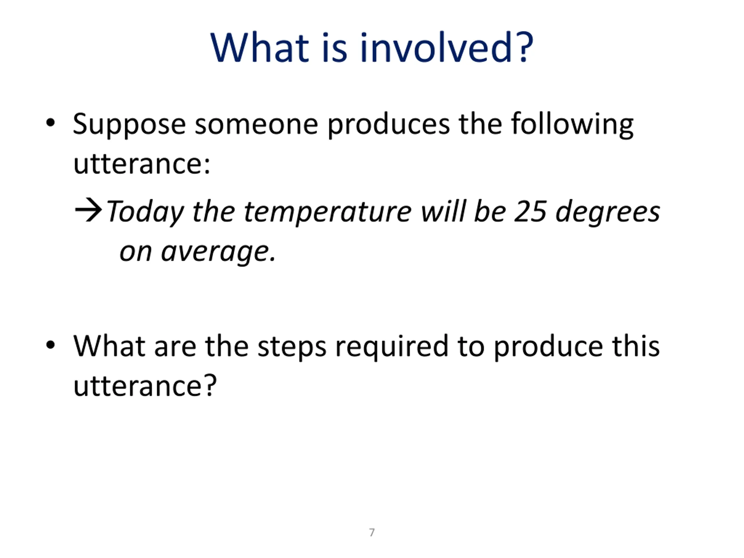 What is involved? Suppose someone produces the following utterance: Today the temperature will be 25 degrees on average. What are the steps required to produce this utterance? 7