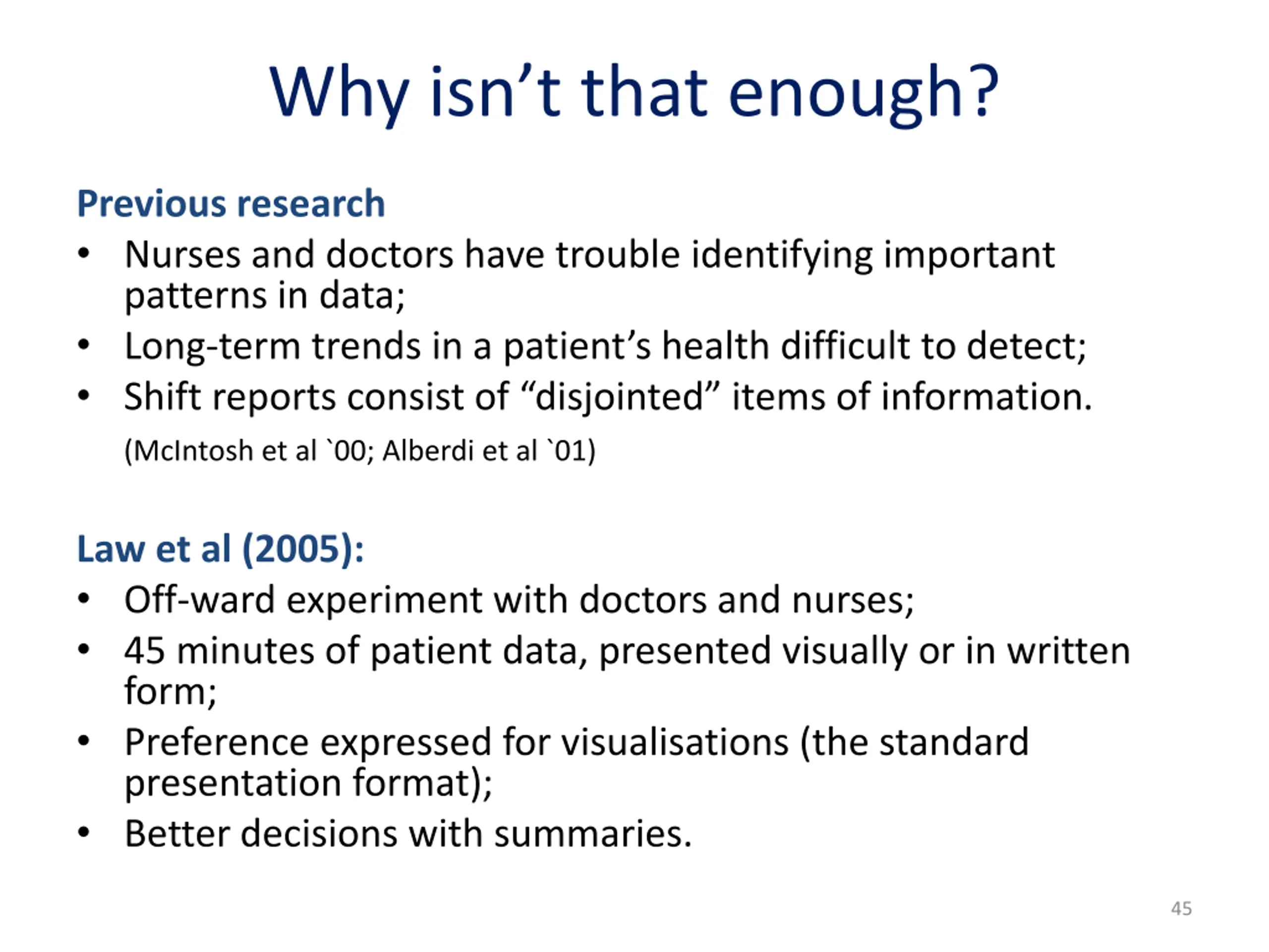 Why isnt that enough? Previous research Nurses and doctors have trouble identifying important patterns in data; Long-term trends in a patient s health difficult to detect; Shift reports consist of disjointed items of information. (McIntosh et al `00; Alberdi et al `01) Law et al (2005): Off-ward experiment with doctors and nurses; 45 minutes of patient data, presented visually or in written form; Preference expressed for visualisations (the standard presentation format); Better decisions with summaries. 45