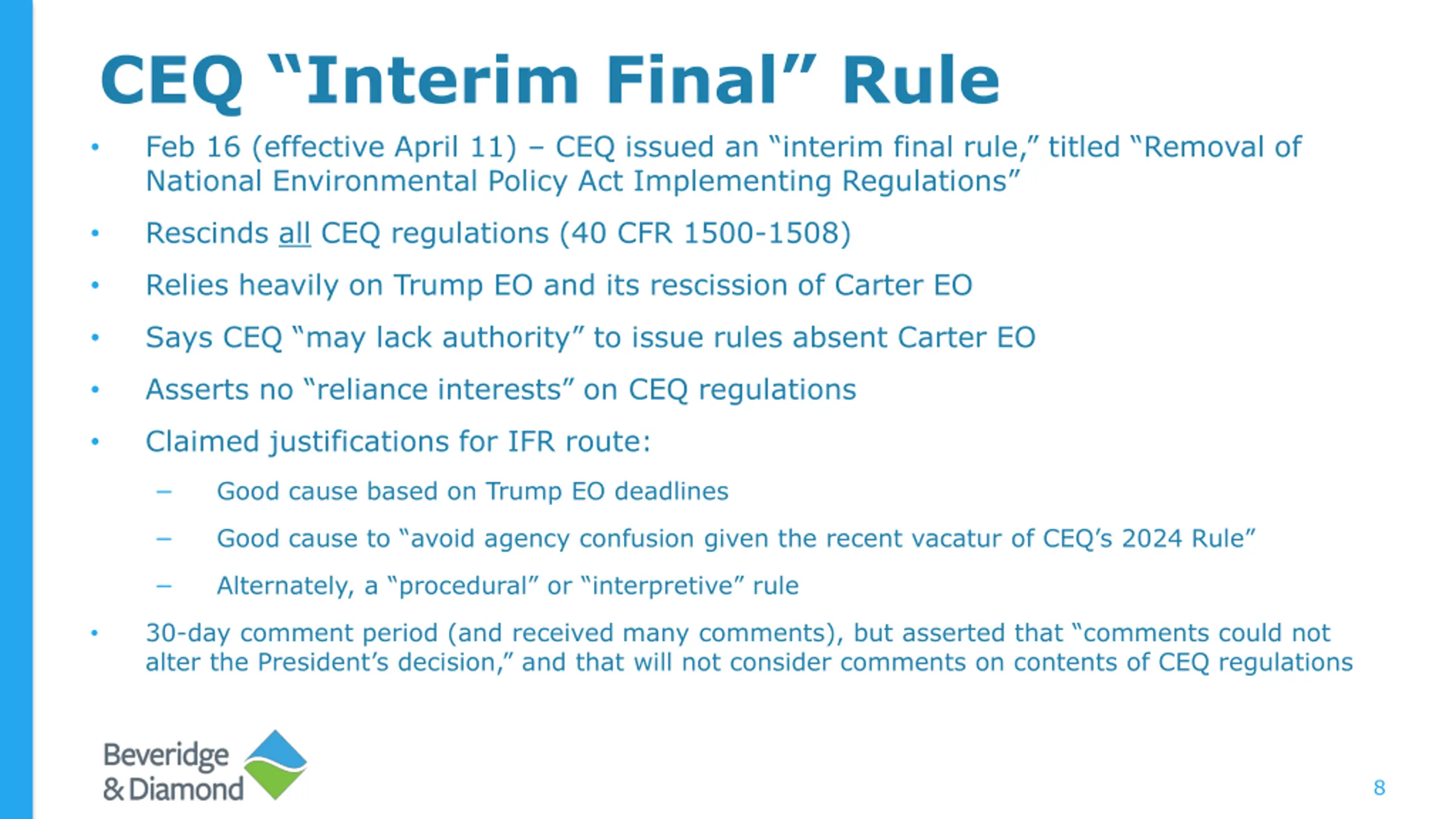 CEQ Interim Final Rule Feb 16 (effective April 11) CEQ issued an interim final rule, titled Removal of National Environmental Policy Act Implementing Regulations Rescinds all CEQ regulations (40 CFR 1500-1508) Relies heavily on Trump EO and its rescission of Carter EO Says CEQ may lack authority to issue rules absent Carter EO Asserts no reliance interests on CEQ regulations Claimed justifications for IFR route: Good cause based on Trump EO deadlines Good cause to avoid agency confusion given the recent vacatur of CEQ s 2024 Rule Alternately, a procedural or interpretive rule 30-day comment period (and received many comments), but asserted that comments could not alter the President s decision, and that will not consider comments on contents of CEQ regulations 8