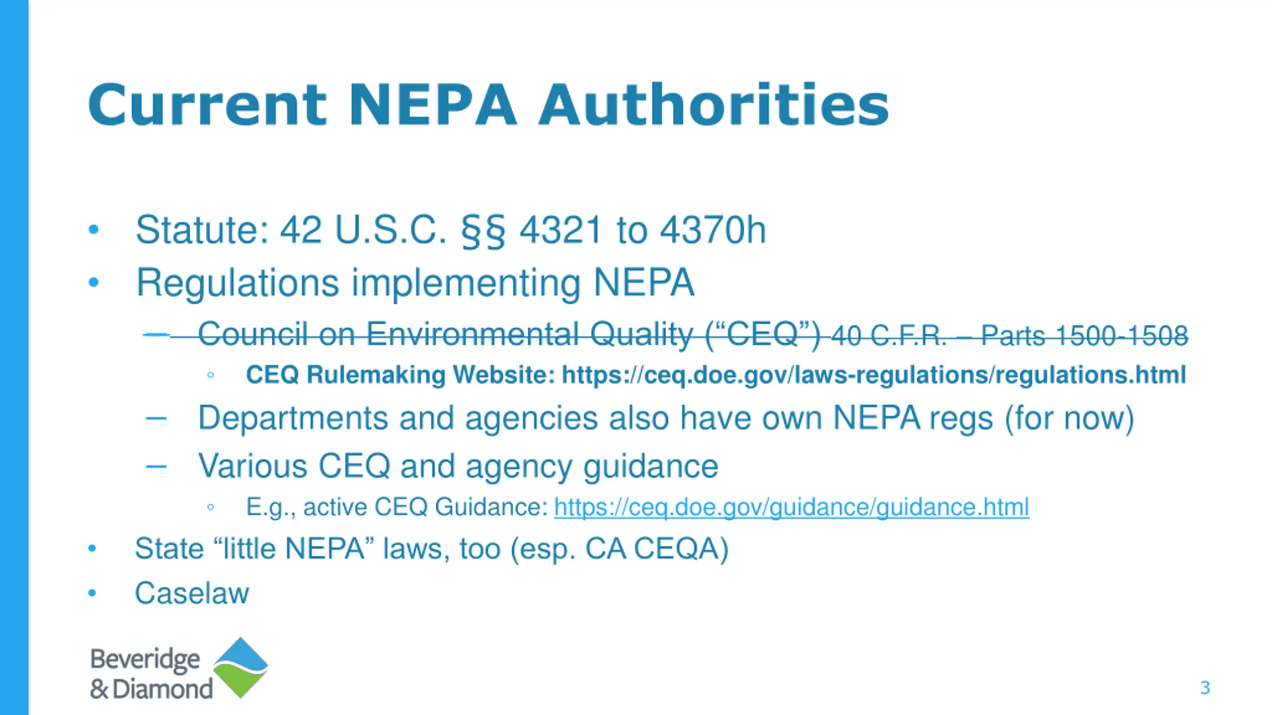 Current NEPA Authorities Statute: 42 U.S.C. 4321 to 4370h Regulations implementing NEPA Council on Environmental Quality ( CEQ ) 40 C.F.R. Parts 1500-1508 CEQ Rulemaking Website: https://ceq.doe.gov/laws-regulations/regulations.html Departments and agencies also have own NEPA regs (for now) Various CEQ and agency guidance E.g., active CEQ Guidance: https://ceq.doe.gov/guidance/guidance.html State little NEPA laws, too (esp. CA CEQA) Caselaw 3