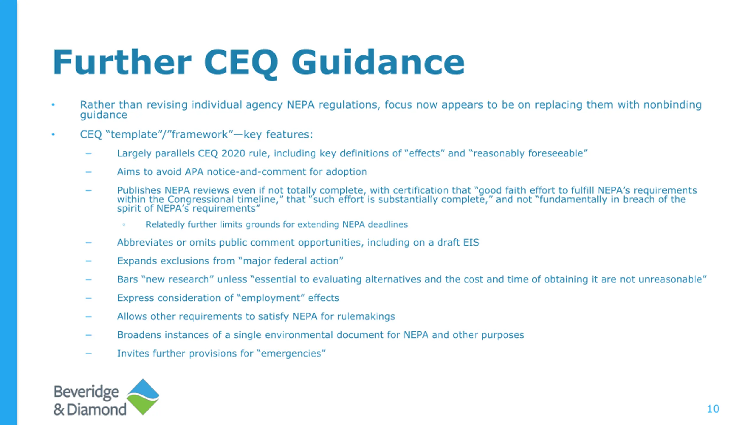 Further CEQ Guidance Rather than revising individual agency NEPA regulations, focus now appears to be on replacing them with nonbinding guidance CEQ template / framework key features: Largely parallels CEQ 2020 rule, including key definitions of effects and reasonably foreseeable Aims to avoid APA notice-and-comment for adoption Publishes NEPA reviews even if not totally complete, with certification that good faith effort to fulfill NEPA s requirements within the Congressional timeline, that such effort is substantially complete, and not fundamentally in breach of the spirit of NEPA s requirements Relatedly further limits grounds for extending NEPA deadlines Abbreviates or omits public comment opportunities, including on a draft EIS Expands exclusions from major federal action Bars new research unless essential to evaluating alternatives and the cost and time of obtaining it are not unreasonable Express consideration of employment effects Allows other requirements to satisfy NEPA for rulemakings Broadens instances of a single environmental document for NEPA and other purposes Invites further provisions for emergencies 10