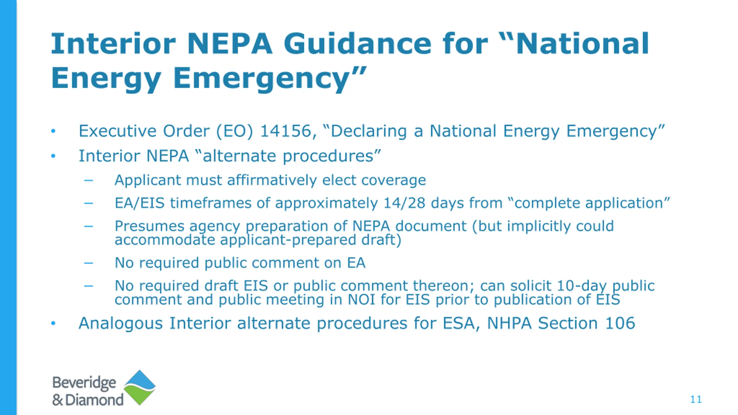 Interior NEPA Guidance for National Energy Emergency Executive Order (EO) 14156, Declaring a National Energy Emergency Interior NEPA alternate procedures Applicant must affirmatively elect coverage EA/EIS timeframes of approximately 14/28 days from complete application Presumes agency preparation of NEPA document (but implicitly could accommodate applicant-prepared draft) No required public comment on EA No required draft EIS or public comment thereon; can solicit 10-day public comment and public meeting in NOI for EIS prior to publication of EIS Analogous Interior alternate procedures for ESA, NHPA Section 106 11