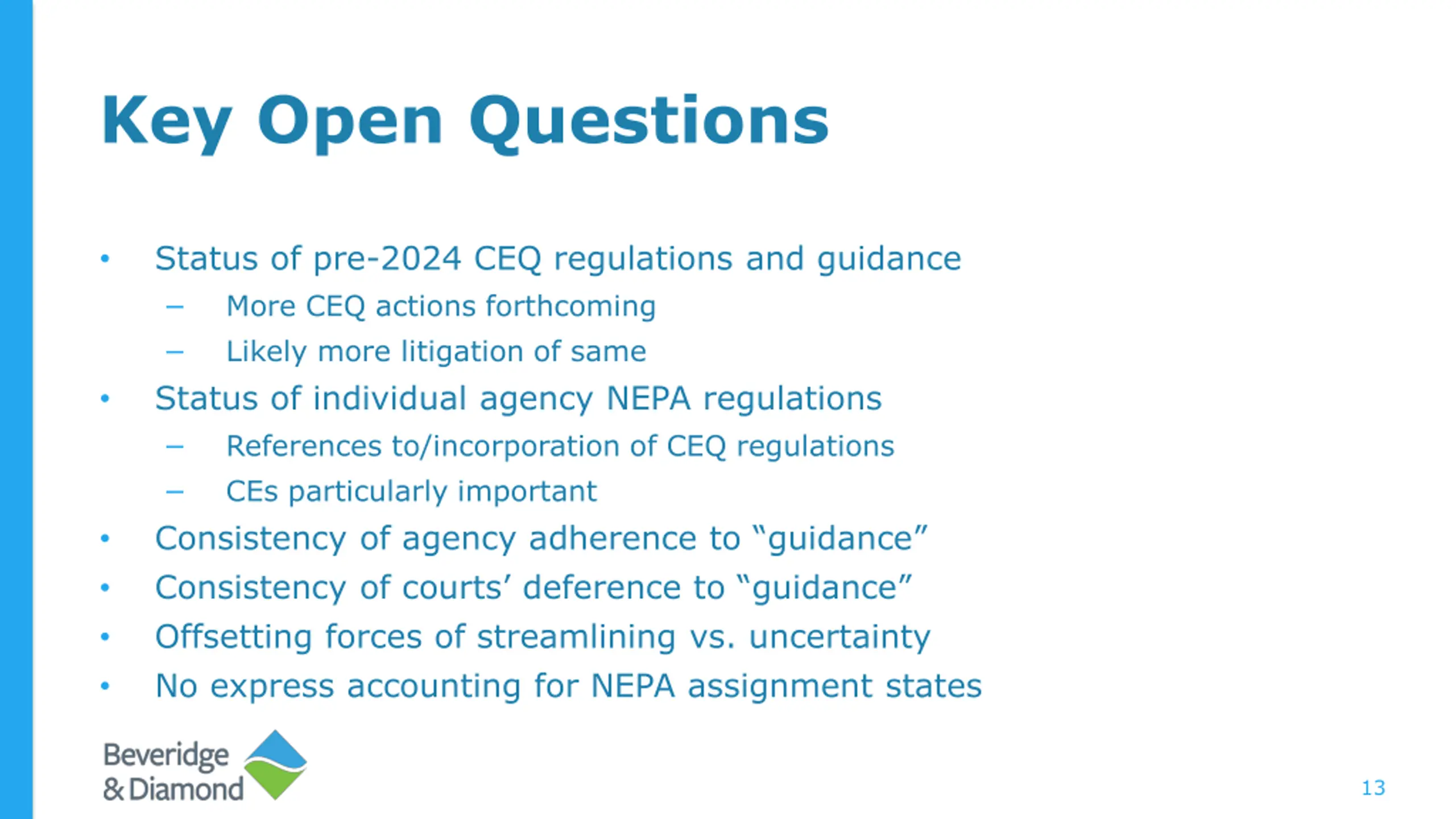 Key Open Questions Status of pre-2024 CEQ regulations and guidance More CEQ actions forthcoming Likely more litigation of same Status of individual agency NEPA regulations References to/incorporation of CEQ regulations CEs particularly important Consistency of agency adherence to guidance Consistency of courts deference to guidance Offsetting forces of streamlining vs. uncertainty No express accounting for NEPA assignment states 13