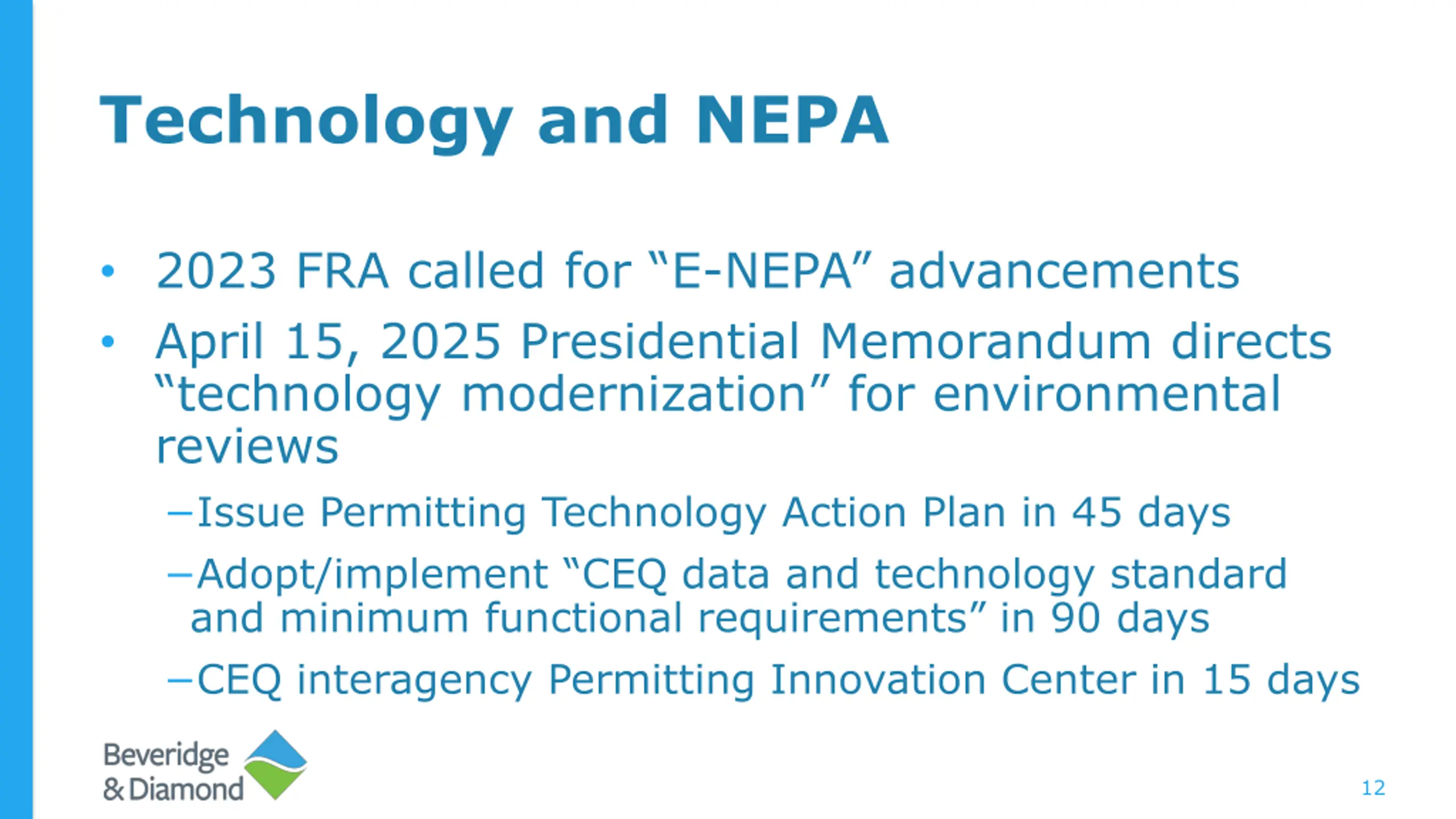 Technology and NEPA 2023 FRA called for E-NEPA advancements April 15, 2025 Presidential Memorandum directs technology modernization for environmental reviews Issue Permitting Technology Action Plan in 45 days Adopt/implement CEQ data and technology standard and minimum functional requirements in 90 days CEQ interagency Permitting Innovation Center in 15 days 12