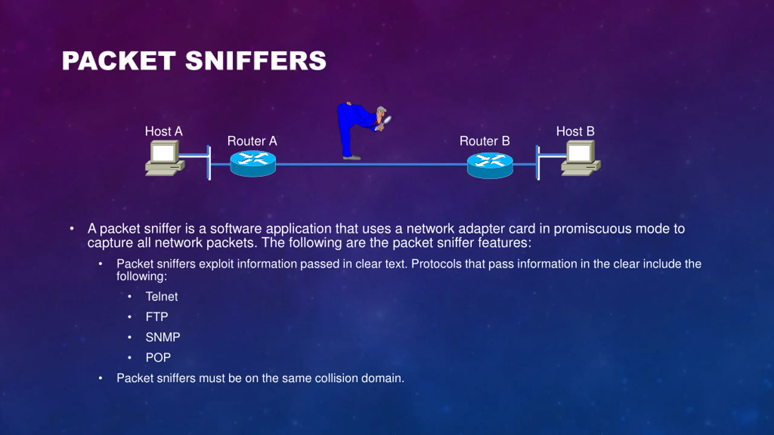 PACKET SNIFFERS Host A Host B Router A Router B A packet sniffer is a software application that uses a network adapter card in promiscuous mode to capture all network packets. The following are the packet sniffer features: Packet sniffers exploit information passed in clear text. Protocols that pass information in the clear include the following: Telnet FTP SNMP POP Packet sniffers must be on the same collision domain.