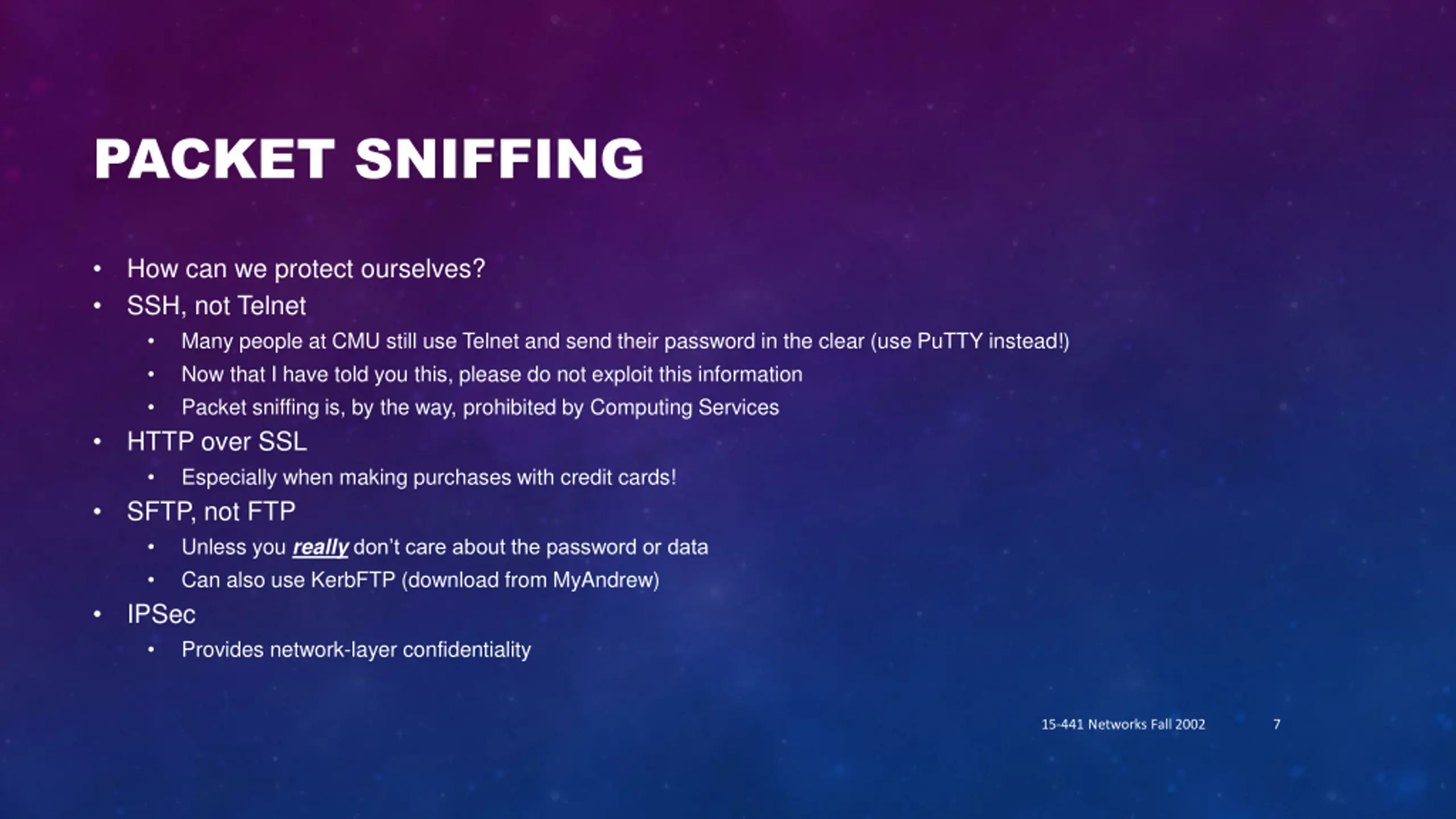 PACKET SNIFFING What kinds of data can we get? Asked another way, what kind of information would be most useful to a malicious user? Answer: Anything in plain text Passwords are the most popular 15-441 Networks Fall 2002 6