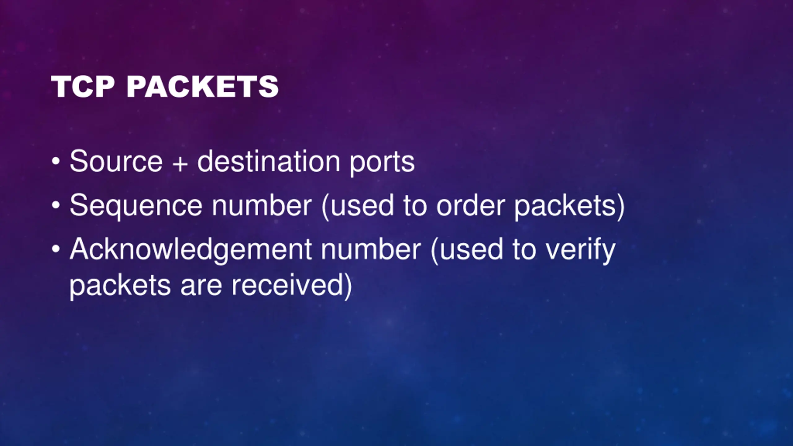 TCP PACKETS Source + destination ports Sequence number (used to order packets) Acknowledgement number (used to verify packets are received)