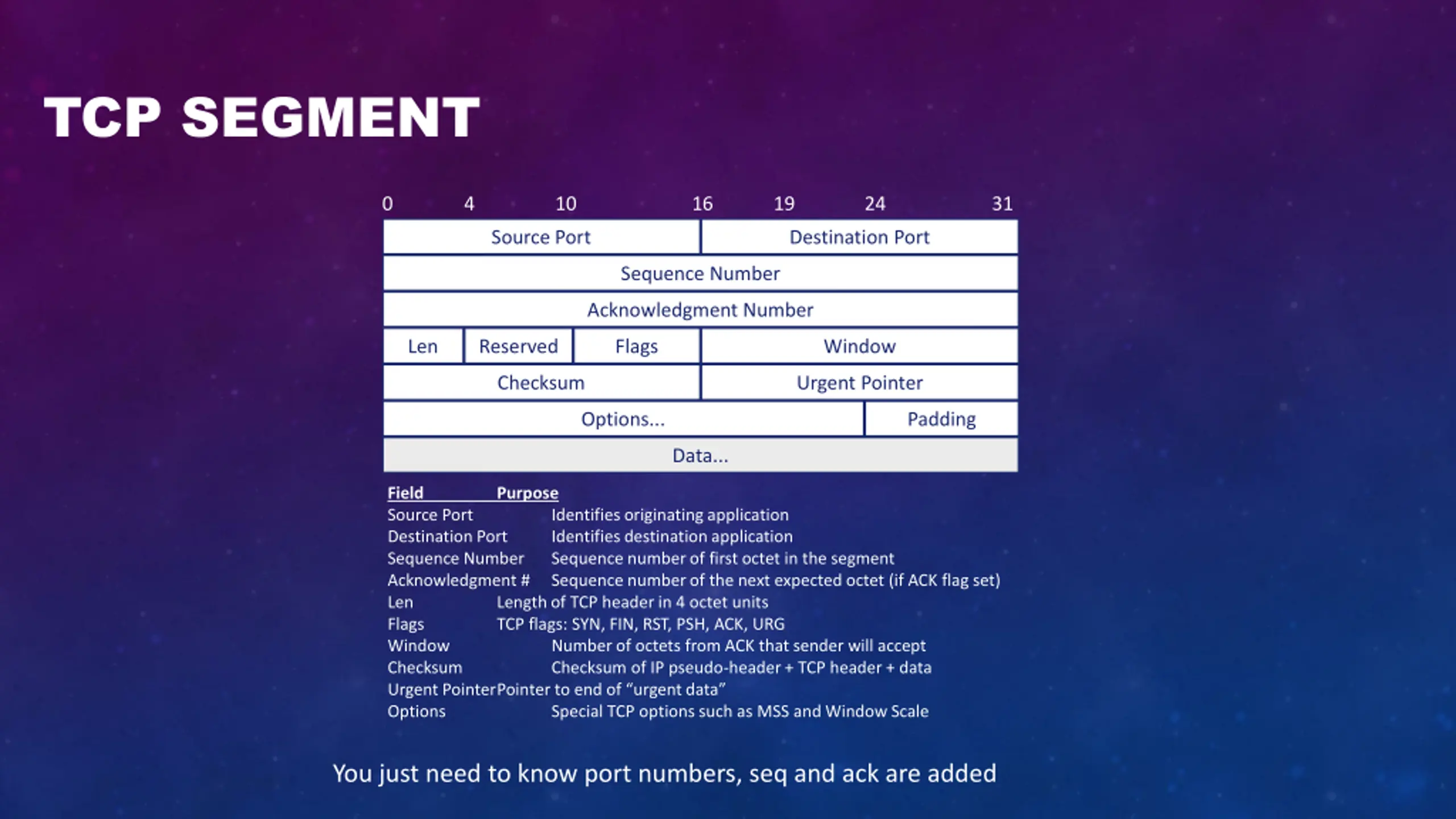 TCP SEGMENT 0 4 10 16 19 24 31 Source Port Destination Port Sequence Number Acknowledgment Number Len Reserved Flags Window Checksum Urgent Pointer Options... Padding Data... Field Source Port Destination Port Sequence Number Acknowledgment # Len Flags Window Checksum Urgent Pointer Pointer to end of urgent data Options Special TCP options such as MSS and Window Scale Purpose Identifies originating application Identifies destination application Sequence number of first octet in the segment Sequence number of the next expected octet (if ACK flag set) Length of TCP header in 4 octet units TCP flags: SYN, FIN, RST, PSH, ACK, URG Number of octets from ACK that sender will accept Checksum of IP pseudo-header + TCP header + data You just need to know port numbers, seq and ack are added