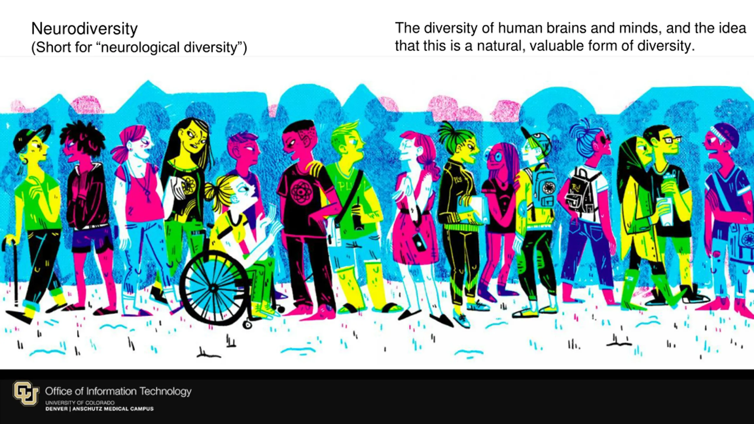 Neurodiversity (Short for neurological diversity ) The diversity of human brains and minds, and the idea that this is a natural, valuable form of diversity.
