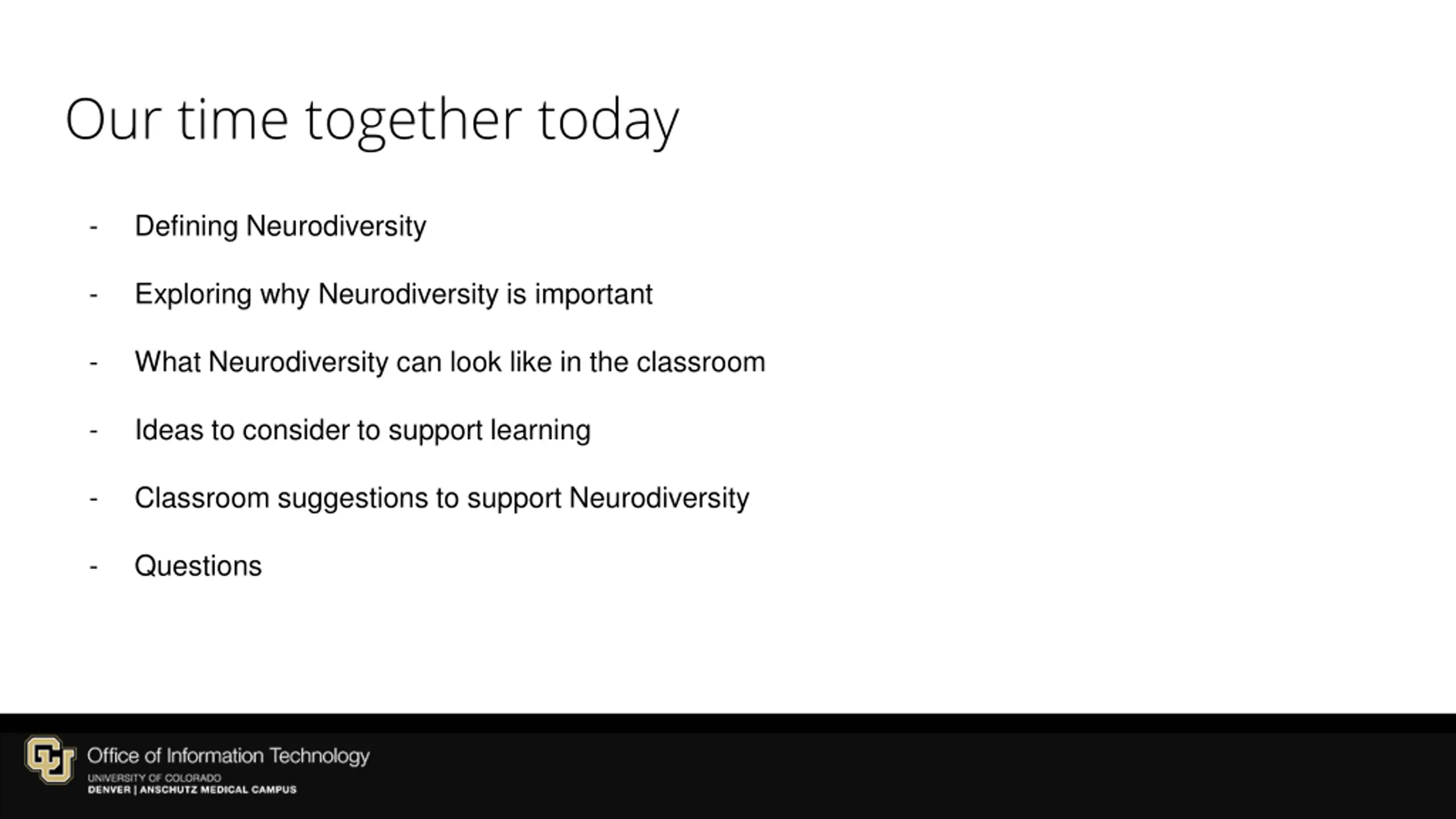 Our time together today - Defining Neurodiversity - Exploring why Neurodiversity is important - What Neurodiversity can look like in the classroom - Ideas to consider to support learning - Classroom suggestions to support Neurodiversity - Questions