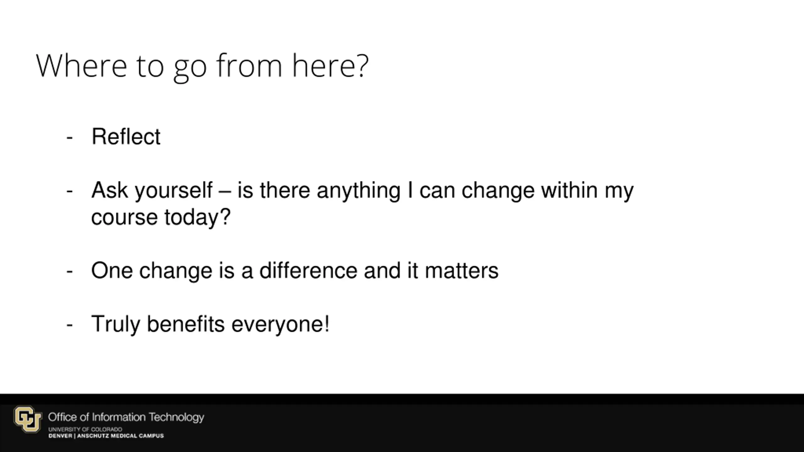 Where to go from here? - Reflect - Ask yourself is there anything I can change within my course today? - One change is a difference and it matters - Truly benefits everyone!