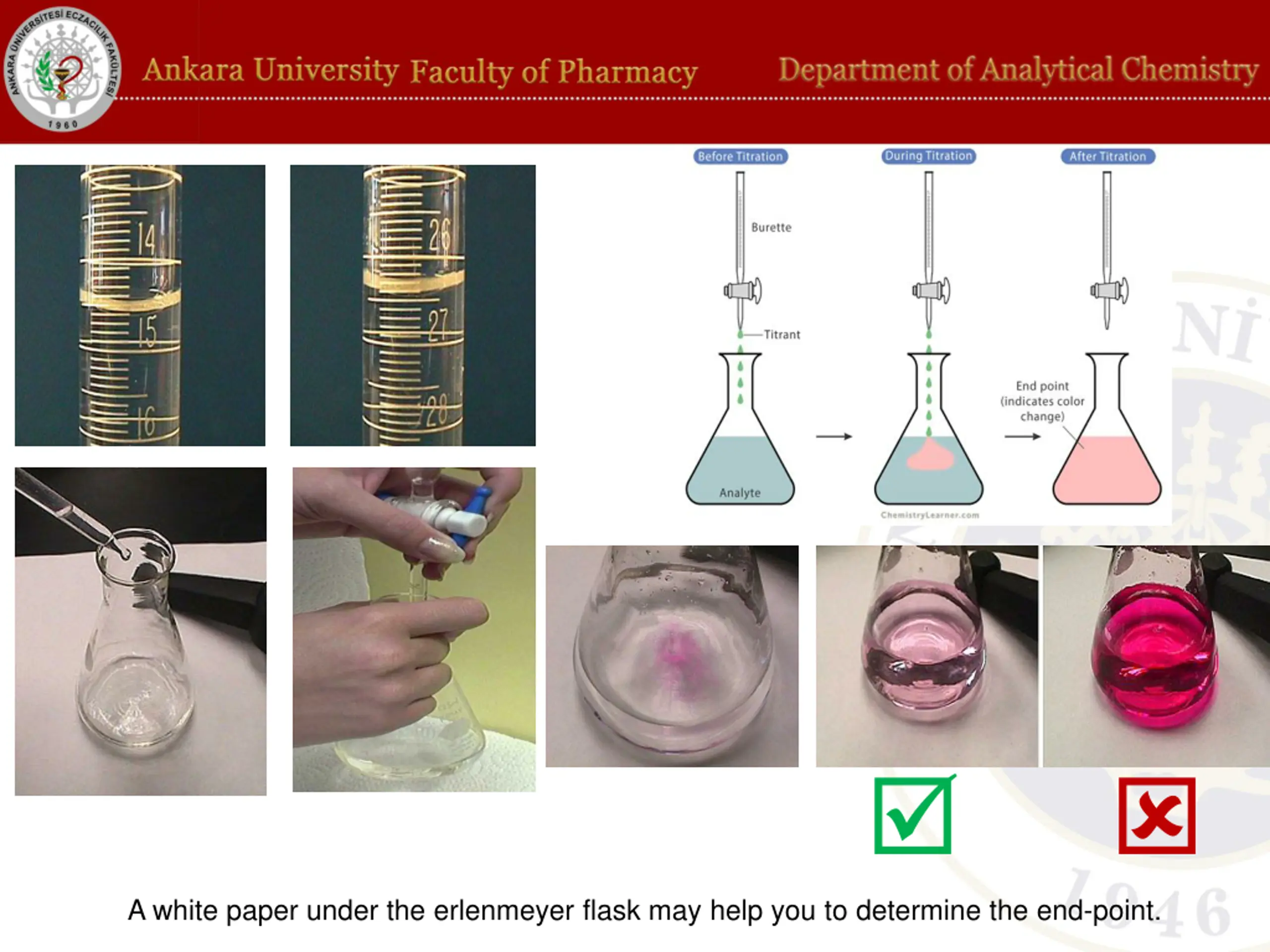 TITRATION PROCEDURE Shake solutions well before starting. Put the analyte a flask and add two drops of indicator. Fill the burette with standard solution (titrant) using a beaker. Turn on the valve (stopcock) and let the tip of the burette fill with liquid as well. Check the tip of the buret for leak or air bubble. If there is a leak, assemble the stopcock properly. If an air bubble is present during a titration, volume readings may be incorrect. To remove an air bubble, whack the side of the burette tip while solution is flowing. Read the level of meniscus and take note. Add the titrant drop by drop into the flask while swirling it. Titration must be performed slowly and always holding stopcock with one hand while swirling the flask with other hand.