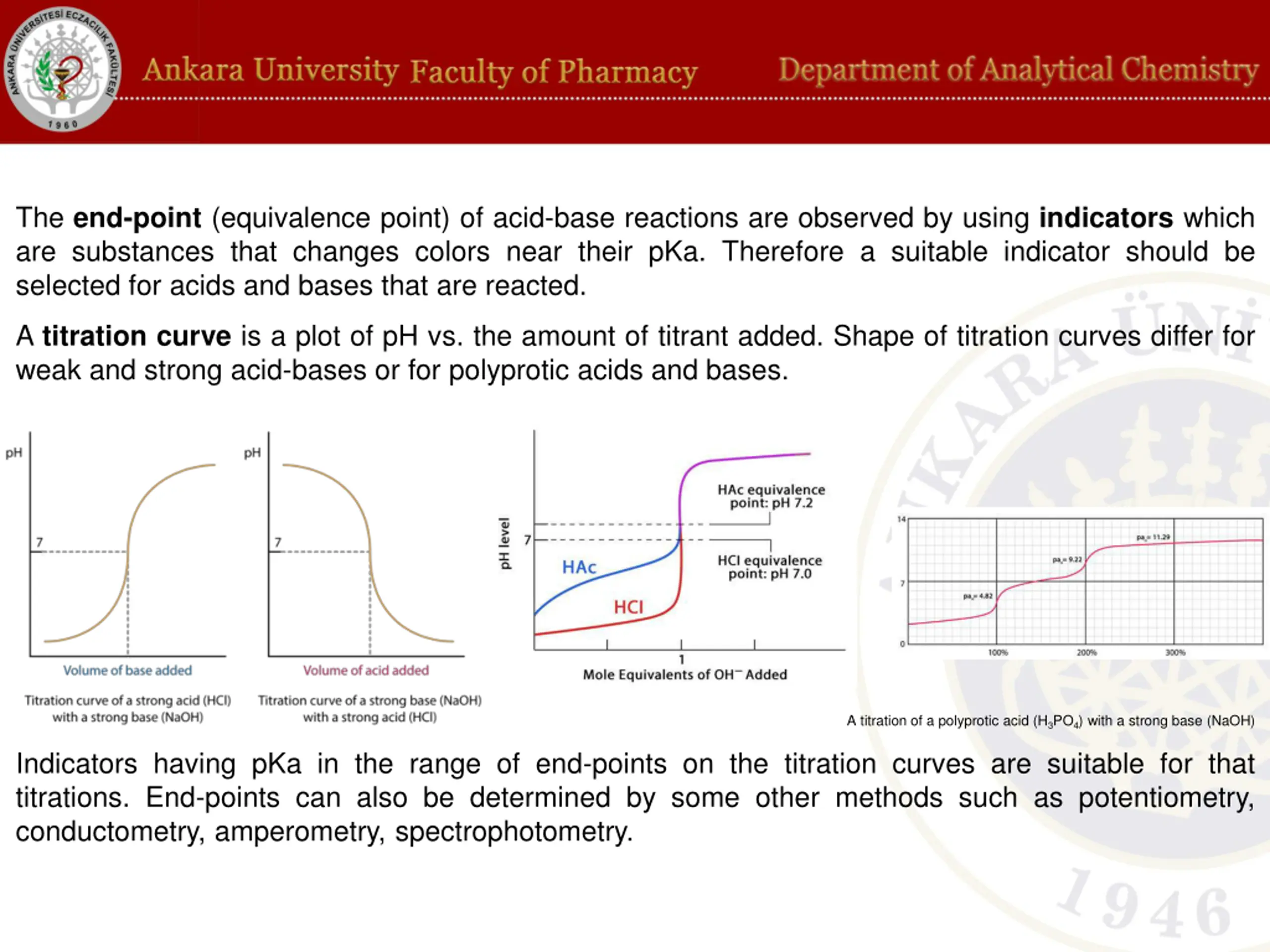 The end-point (equivalence point) of acid-base reactions are observed by using indicators which are substances that changes colors near their pKa. Therefore a suitable indicator should be selected for acids and bases that are reacted. A titration curve is a plot of pH vs. the amount of titrant added. Shape of titration curves differ for weak and strong acid-bases or for polyprotic acids and bases. A titration of a polyprotic acid (H3PO4) with a strong base (NaOH) Indicators having pKa in the range of end-points on the titration curves are suitable for that titrations. End-points can also be determined by some other methods such as potentiometry, conductometry, amperometry, spectrophotometry.
