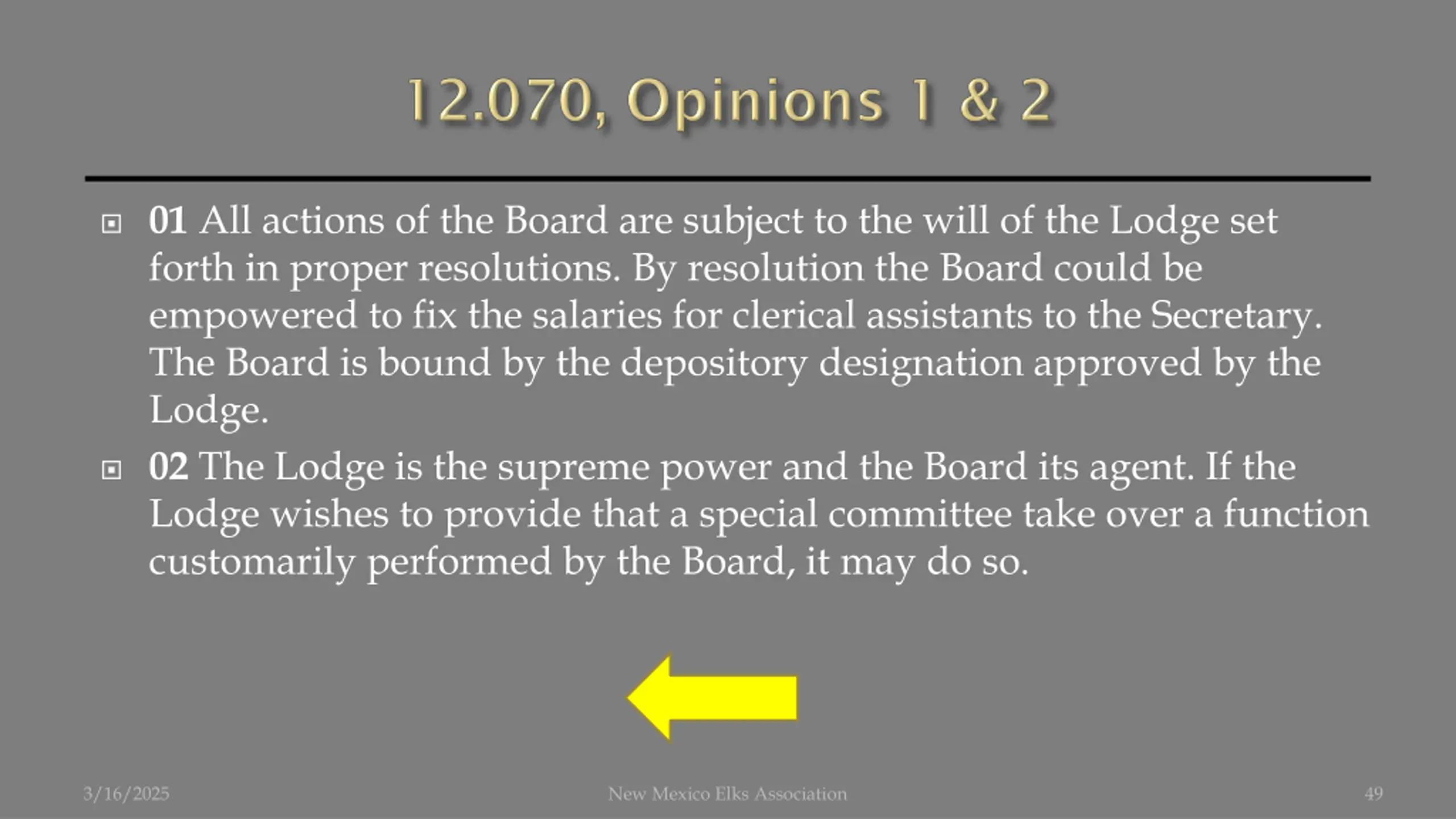 01 All actions of the Board are subject to the will of the Lodge set forth in proper resolutions. By resolution the Board could be empowered to fix the salaries for clerical assistants to the Secretary. The Board is bound by the depository designation approved by the Lodge. 02 The Lodge is the supreme power and the Board its agent. If the Lodge wishes to provide that a special committee take over a function customarily performed by the Board, it may do so. 3/16/2025 New Mexico Elks Association 49