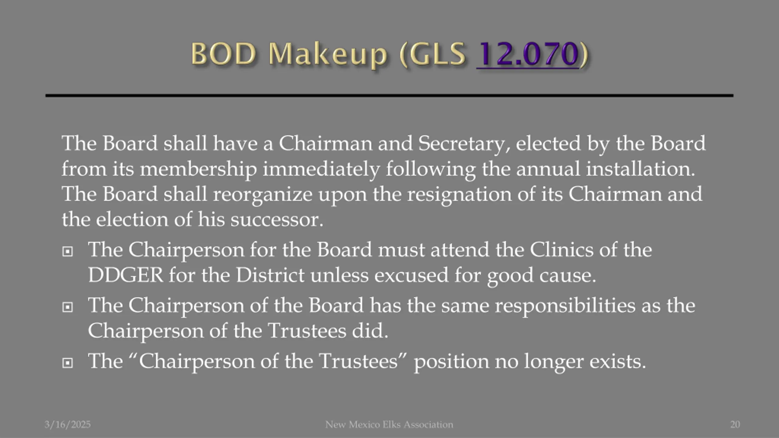 12.070 The Board shall have a Chairman and Secretary, elected by the Board from its membership immediately following the annual installation. The Board shall reorganize upon the resignation of its Chairman and the election of his successor. The Chairperson for the Board must attend the Clinics of the DDGER for the District unless excused for good cause. The Chairperson of the Board has the same responsibilities as the Chairperson of the Trustees did. The Chairperson of the Trustees position no longer exists. 3/16/2025 New Mexico Elks Association 20