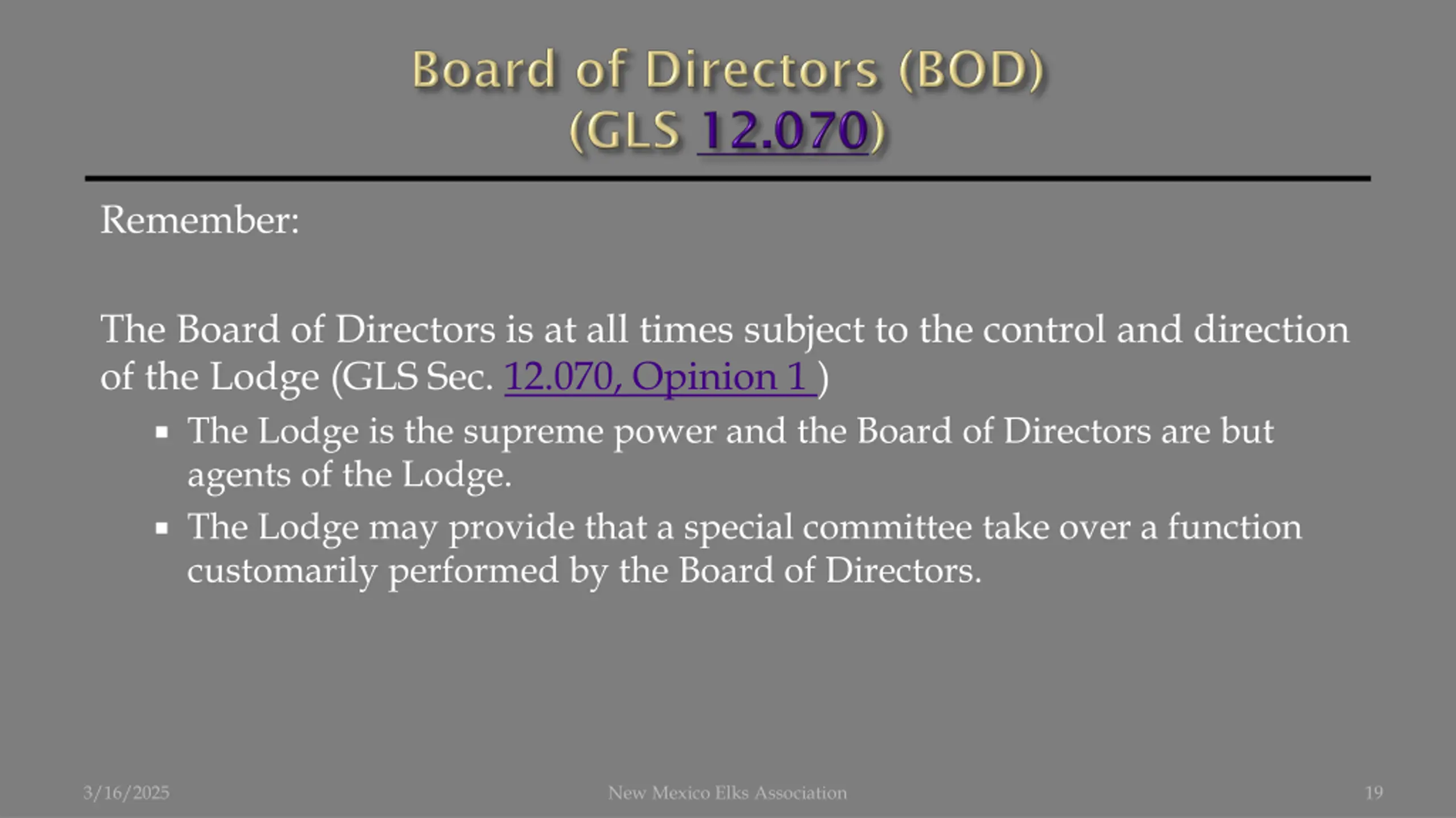 12.070 Remember: The Board of Directors is at all times subject to the control and direction of the Lodge (GLS Sec. 12.070, Opinion 1 ) The Lodge is the supreme power and the Board of Directors are but agents of the Lodge. The Lodge may provide that a special committee take over a function customarily performed by the Board of Directors. 3/16/2025 New Mexico Elks Association 19