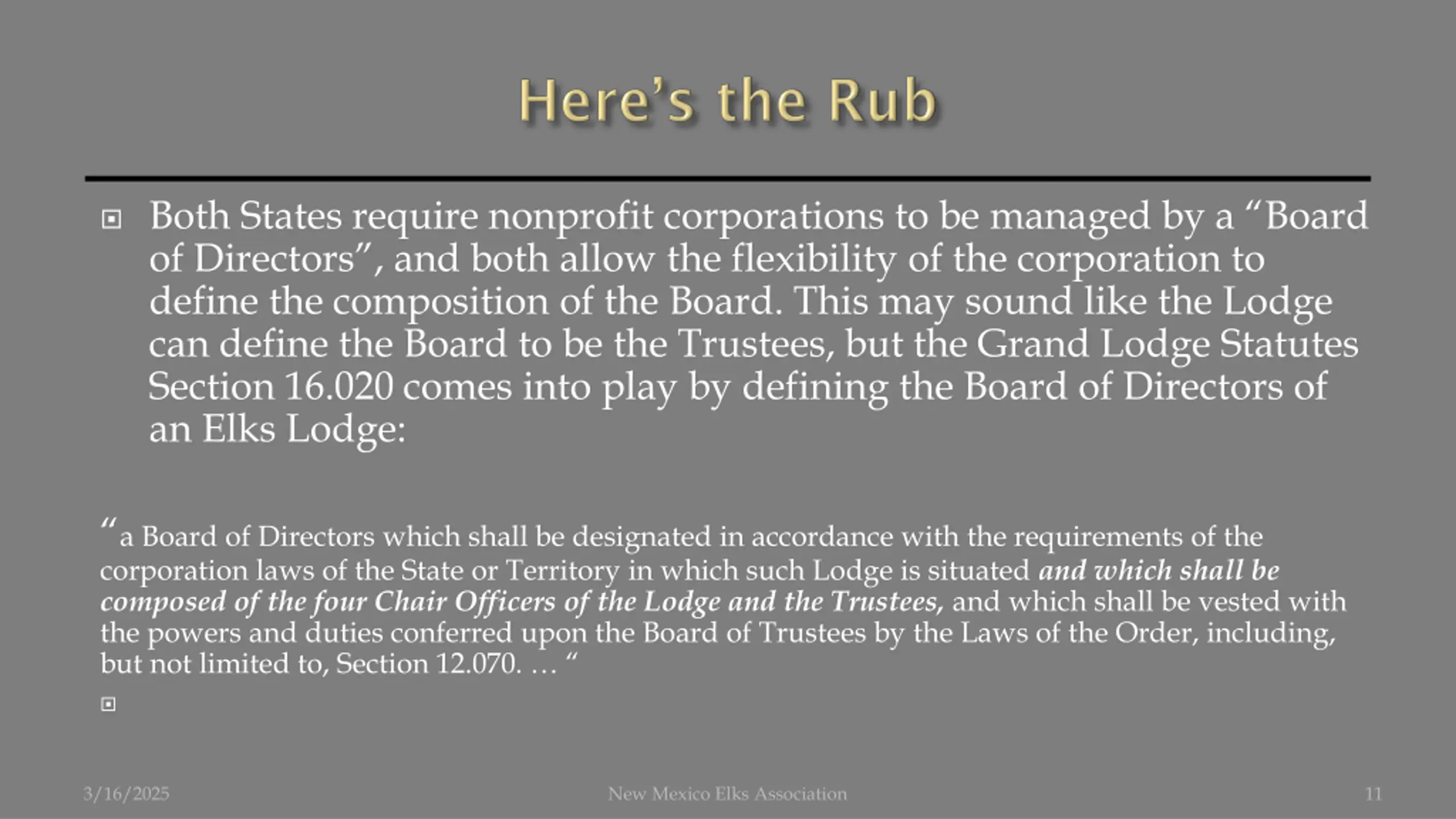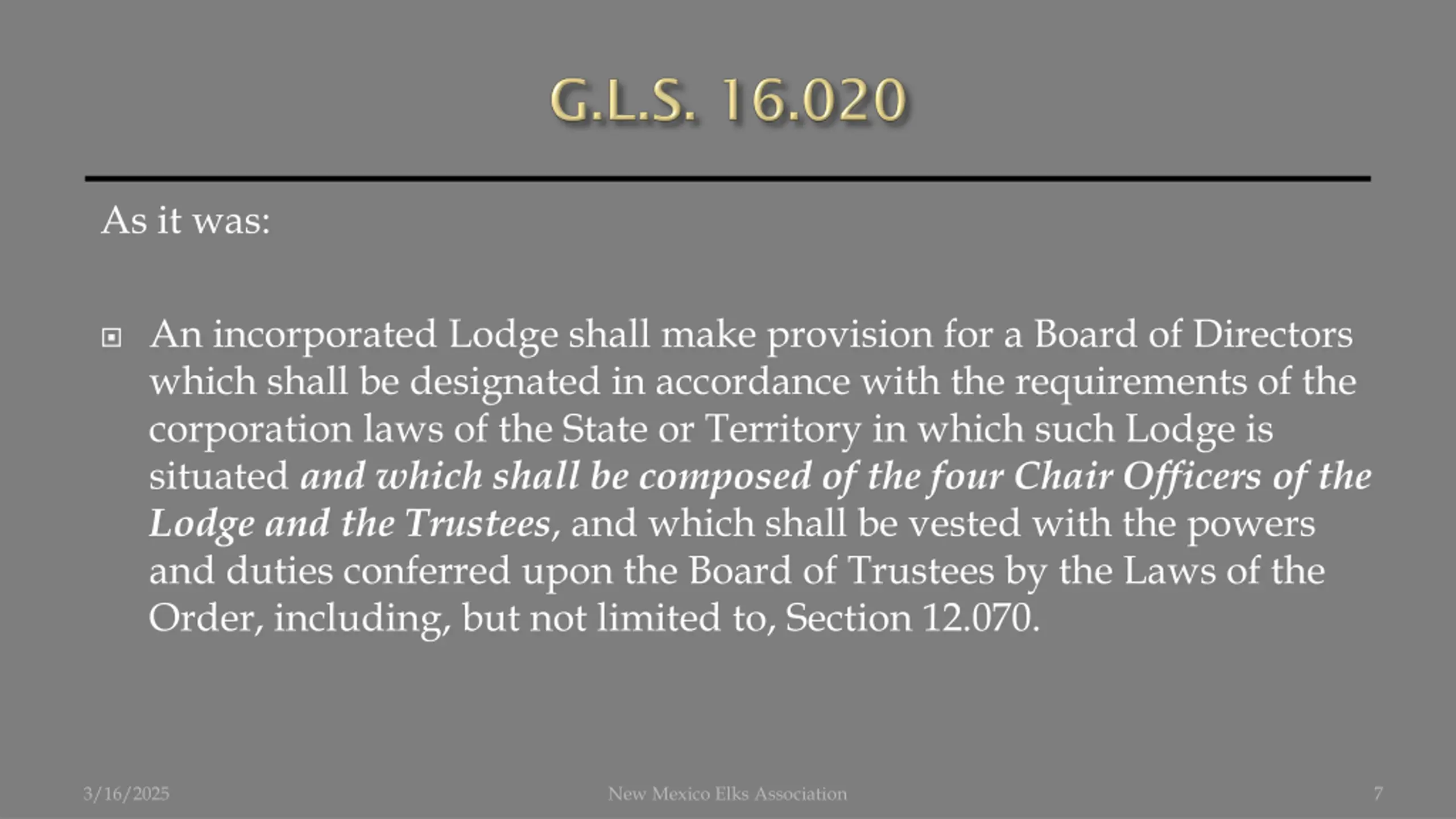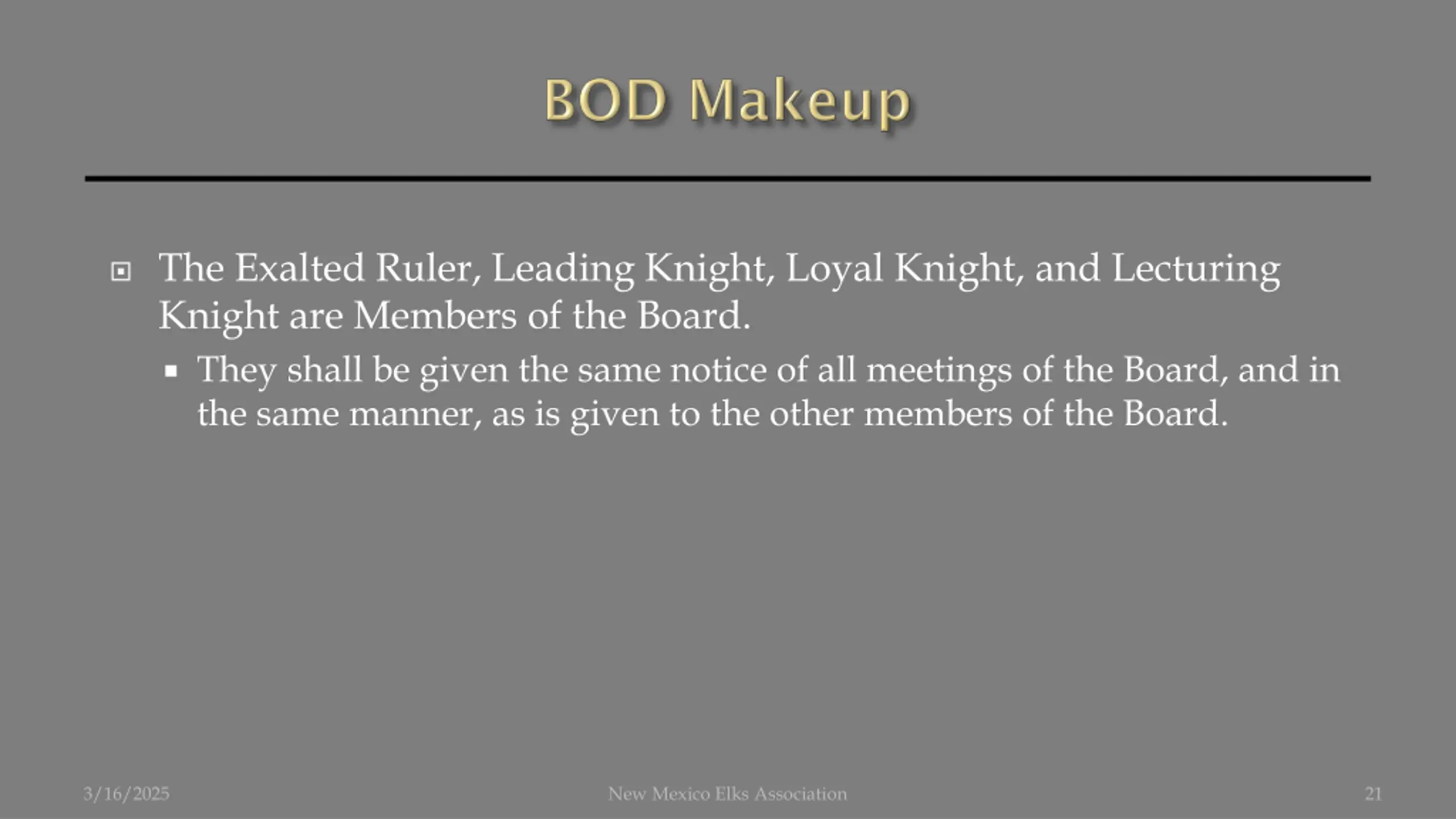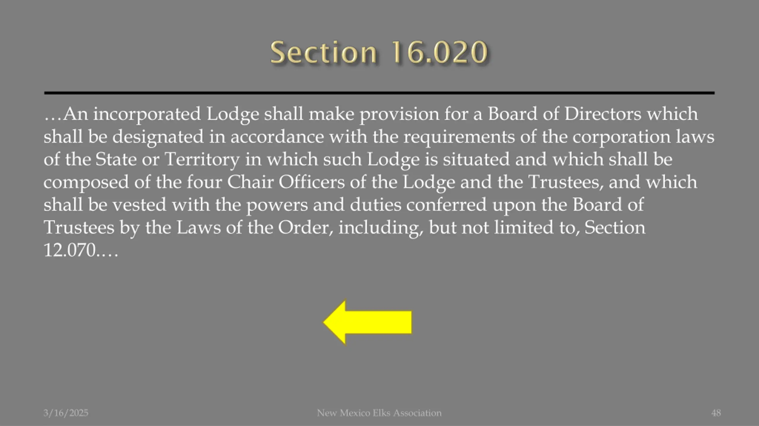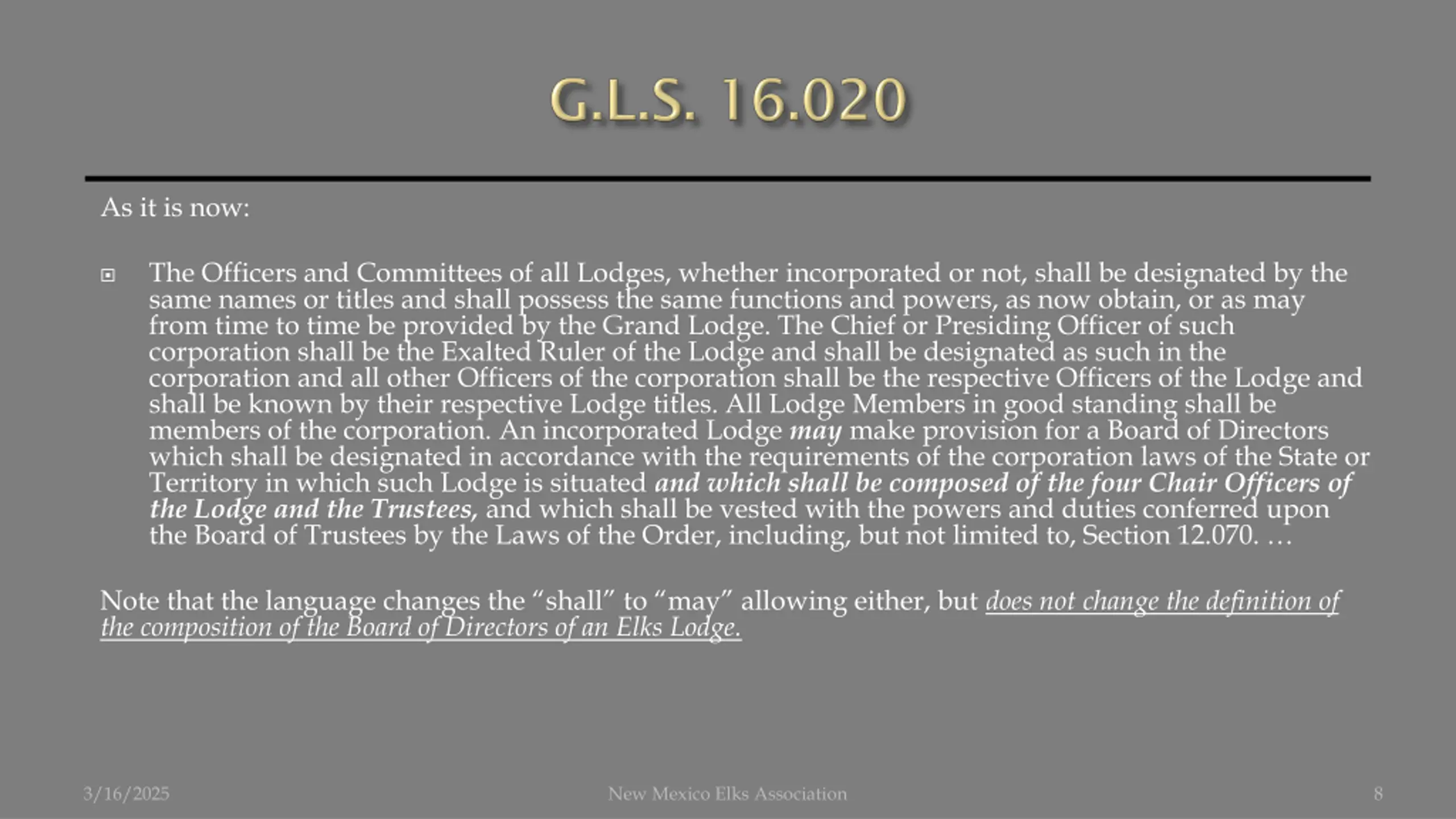 As it is now: The Officers and Committees of all Lodges, whether incorporated or not, shall be designated by the same names or titles and shall possess the same functions and powers, as now obtain, or as may from time to time be provided by the Grand Lodge. The Chief or Presiding Officer of such corporation shall be the Exalted Ruler of the Lodge and shall be designated as such in the corporation and all other Officers of the corporation shall be the respective Officers of the Lodge and shall be known by their respective Lodge titles. All Lodge Members in good standing shall be members of the corporation. An incorporated Lodge may make provision for a Board of Directors which shall be designated in accordance with the requirements of the corporation laws of the State or Territory in which such Lodge is situated and which shall be composed of the four Chair Officers of the Lodge and the Trustees, and which shall be vested with the powers and duties conferred upon the Board of Trustees by the Laws of the Order, including, but not limited to, Section 12.070. Note that the language changes the shall to may allowing either, but does not change the definition of the composition of the Board of Directors of an Elks Lodge. 3/16/2025 New Mexico Elks Association 8