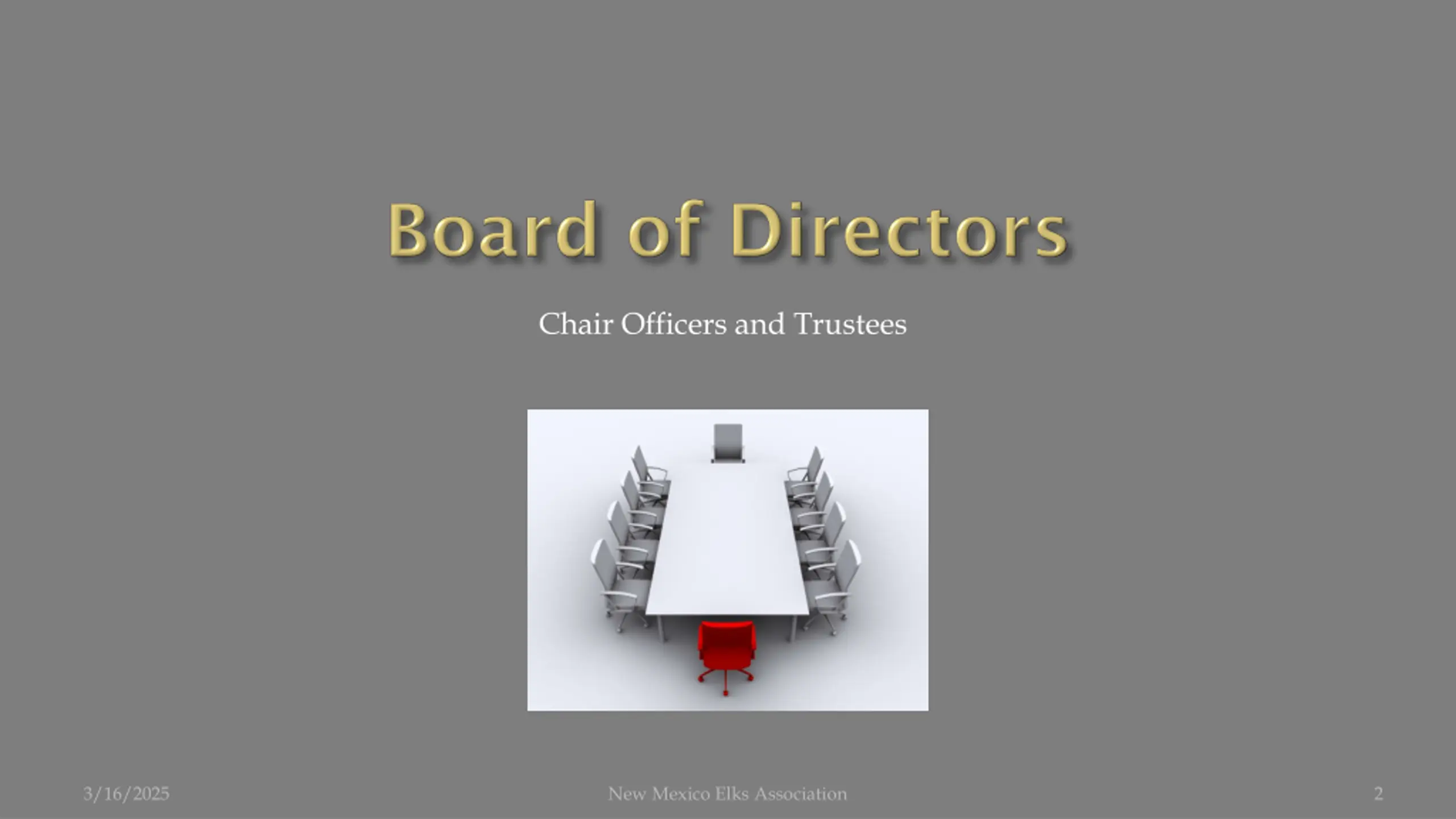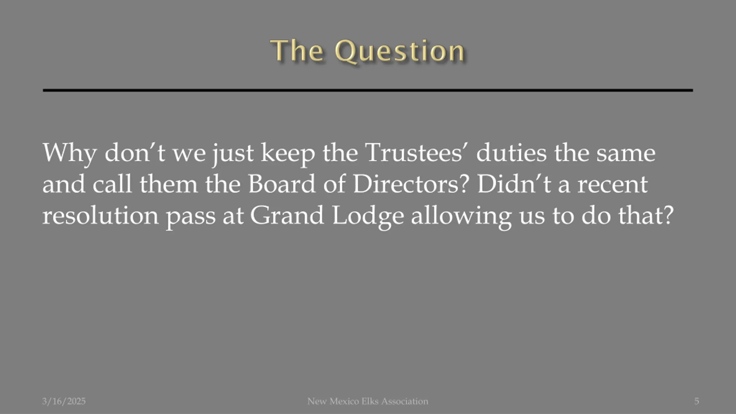 Why dont we just keep the Trustees duties the same and call them the Board of Directors? Didn t a recent resolution pass at Grand Lodge allowing us to do that? 3/16/2025 New Mexico Elks Association 5