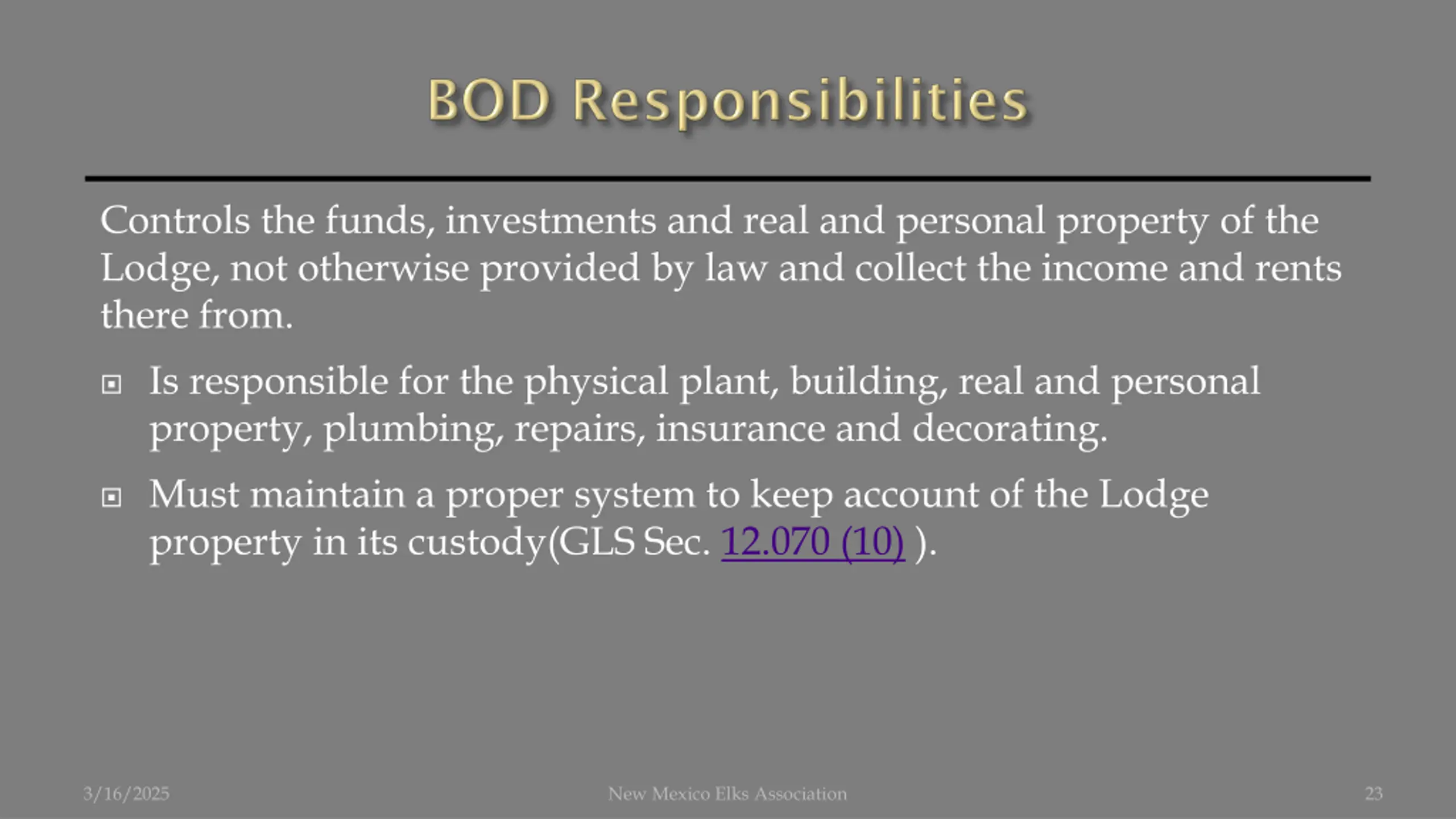 Controls the funds, investments and real and personal property of the Lodge, not otherwise provided by law and collect the income and rents there from. Is responsible for the physical plant, building, real and personal property, plumbing, repairs, insurance and decorating. Must maintain a proper system to keep account of the Lodge property in its custody(GLS Sec. 12.070 (10) ). 3/16/2025 New Mexico Elks Association 23