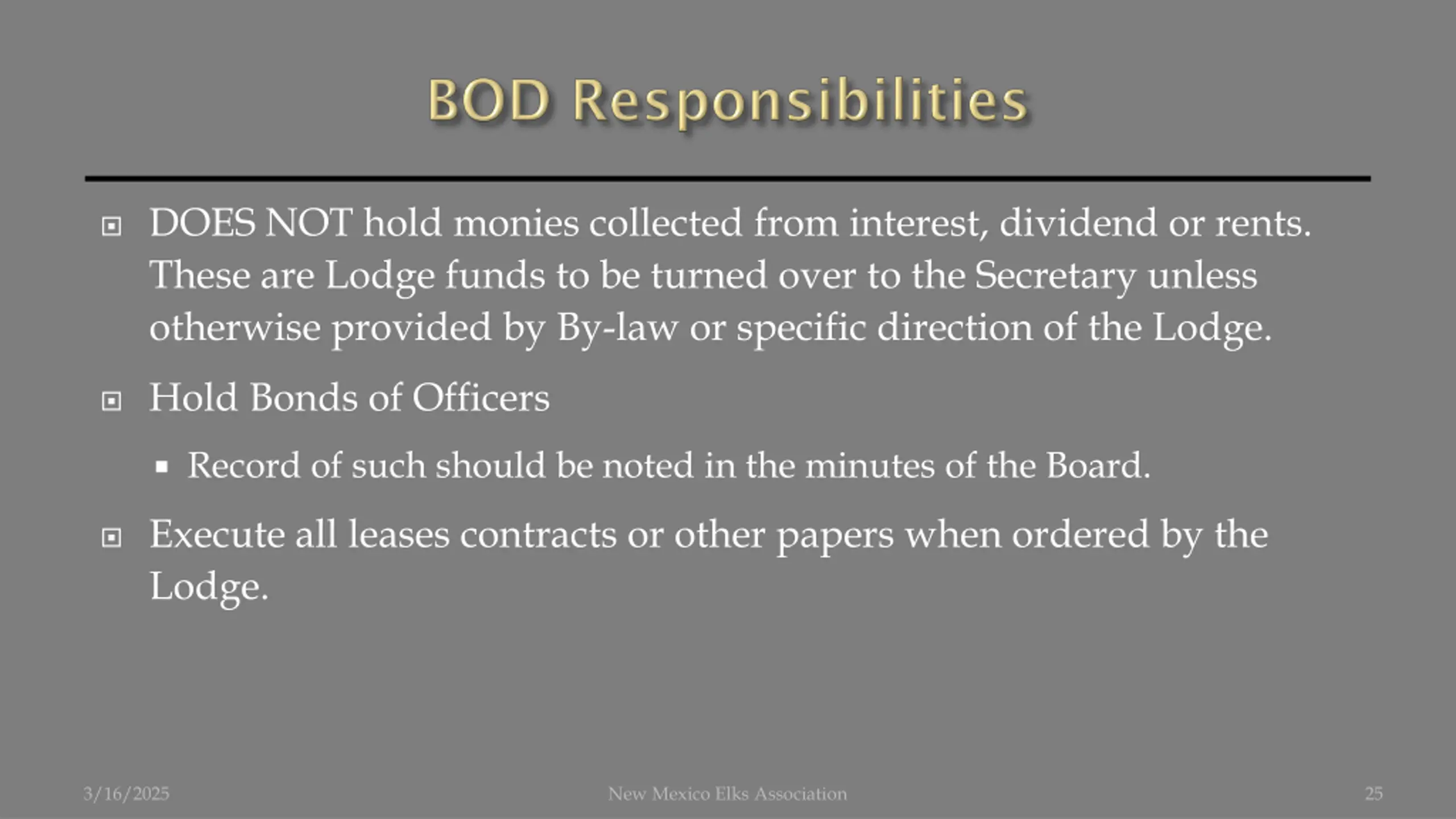 DOES NOT hold monies collected from interest, dividend or rents. These are Lodge funds to be turned over to the Secretary unless otherwise provided by By-law or specific direction of the Lodge. Hold Bonds of Officers Record of such should be noted in the minutes of the Board. Execute all leases contracts or other papers when ordered by the Lodge. 3/16/2025 New Mexico Elks Association 25