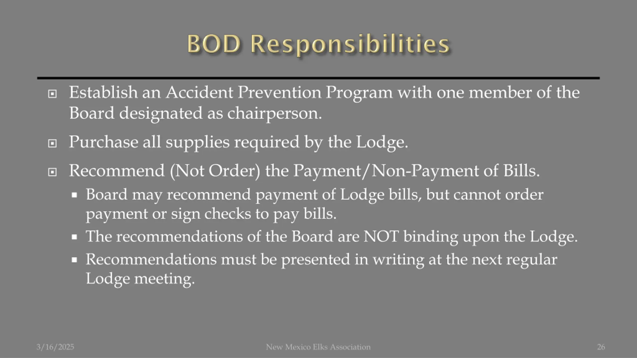 Establish an Accident Prevention Program with one member of the Board designated as chairperson. Purchase all supplies required by the Lodge. Recommend (Not Order) the Payment/Non-Payment of Bills. Board may recommend payment of Lodge bills, but cannot order payment or sign checks to pay bills. The recommendations of the Board are NOT binding upon the Lodge. Recommendations must be presented in writing at the next regular Lodge meeting. 3/16/2025 New Mexico Elks Association 26