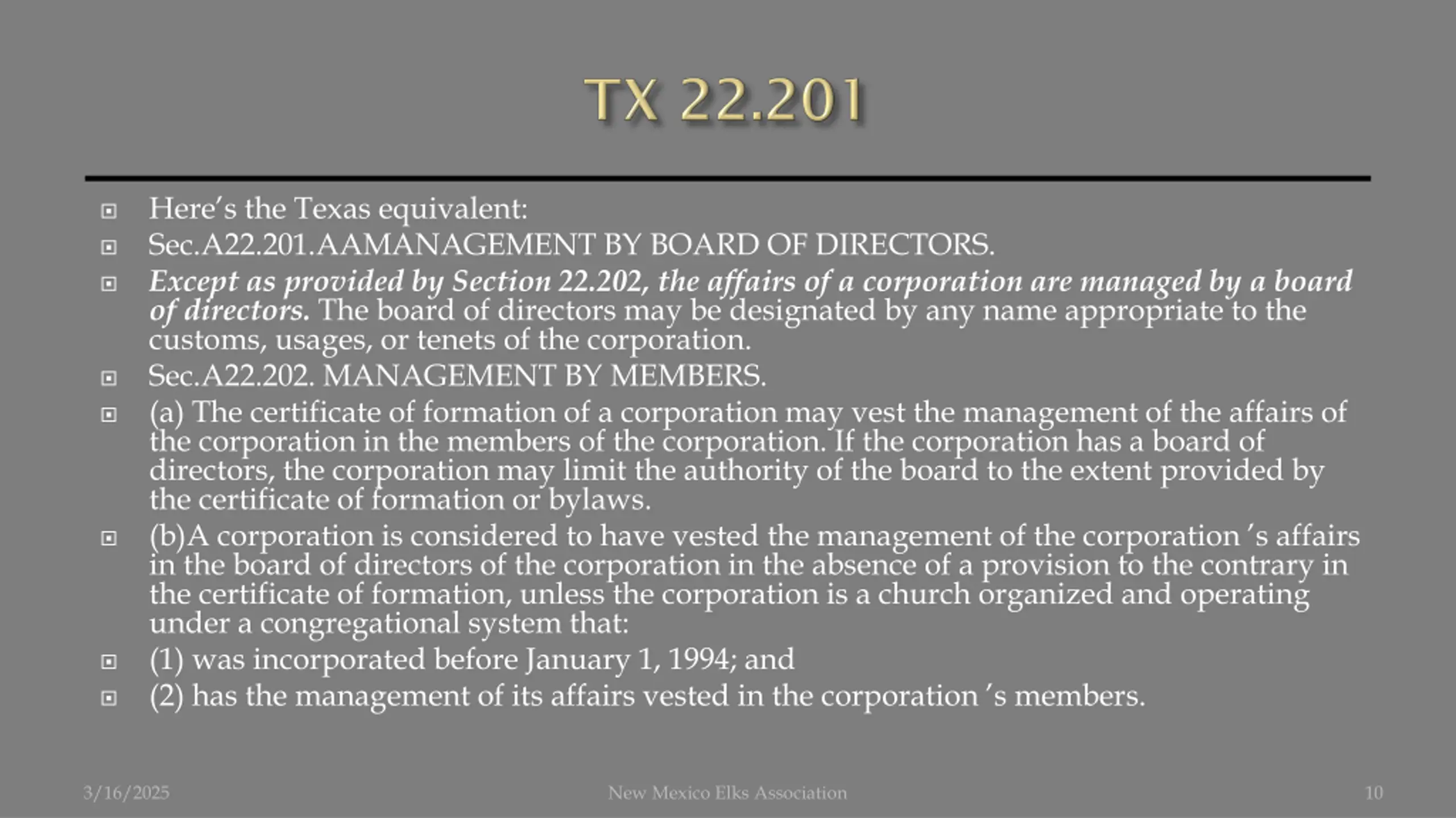 Heres the Texas equivalent: Sec.A22.201.AAMANAGEMENT BY BOARD OF DIRECTORS. Except as provided by Section 22.202, the affairs of a corporation are managed by a board of directors. The board of directors may be designated by any name appropriate to the customs, usages, or tenets of the corporation. Sec.A22.202. MANAGEMENT BY MEMBERS. (a) The certificate of formation of a corporation may vest the management of the affairs of the corporation in the members of the corporation. If the corporation has a board of directors, the corporation may limit the authority of the board to the extent provided by the certificate of formation or bylaws. (b)A corporation is considered to have vested the management of the corporation s affairs in the board of directors of the corporation in the absence of a provision to the contrary in the certificate of formation, unless the corporation is a church organized and operating under a congregational system that: (1) was incorporated before January 1, 1994; and (2) has the management of its affairs vested in the corporation s members. 3/16/2025 New Mexico Elks Association 10