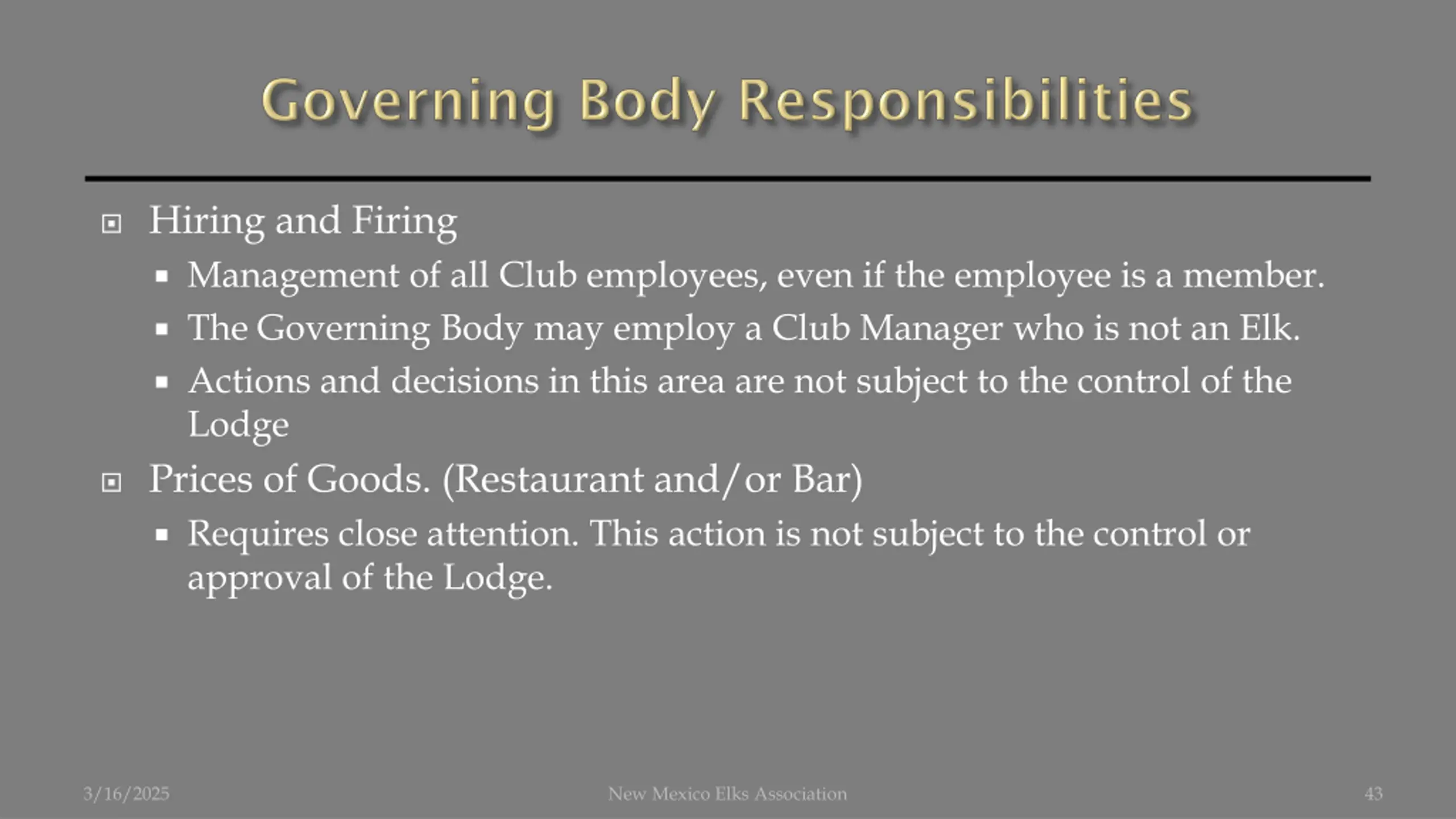 Hiring and Firing Management of all Club employees, even if the employee is a member. The Governing Body may employ a Club Manager who is not an Elk. Actions and decisions in this area are not subject to the control of the Lodge Prices of Goods. (Restaurant and/or Bar) Requires close attention. This action is not subject to the control or approval of the Lodge. 3/16/2025 New Mexico Elks Association 43